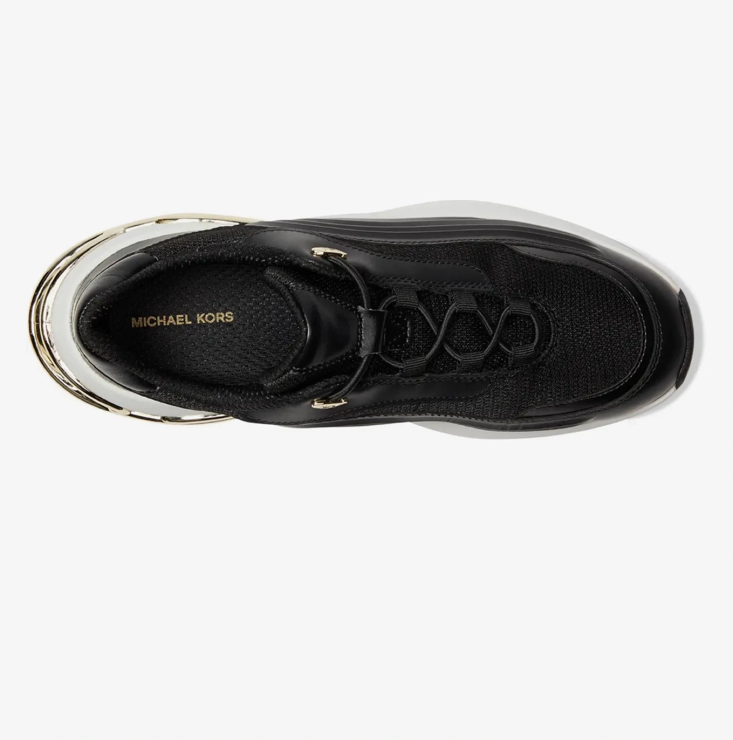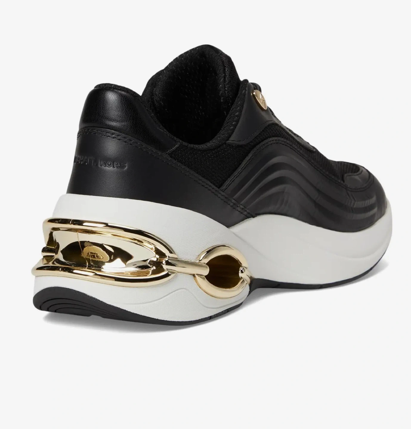 Faux leather insole. These stylish Michael Kors sneakers feature a black mesh and leather upper with eye-catching gold accent details on the heel. They have a comfortable white chunky sole. Perfect for adding a touch of luxury to your everyday look!