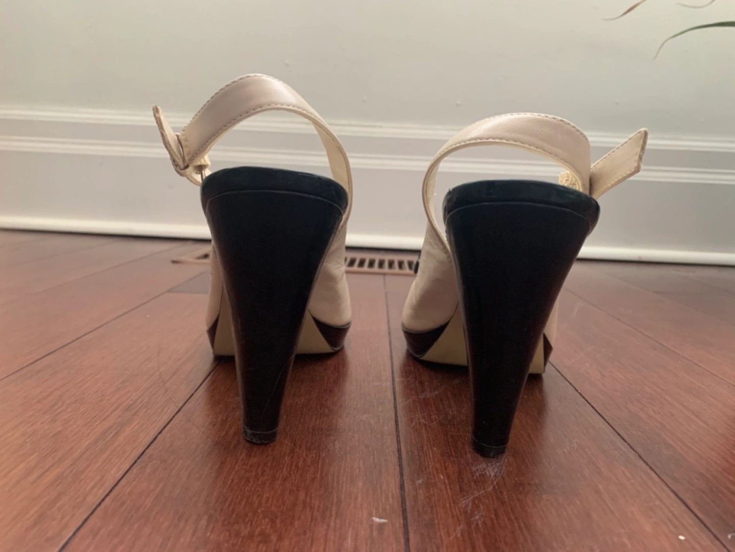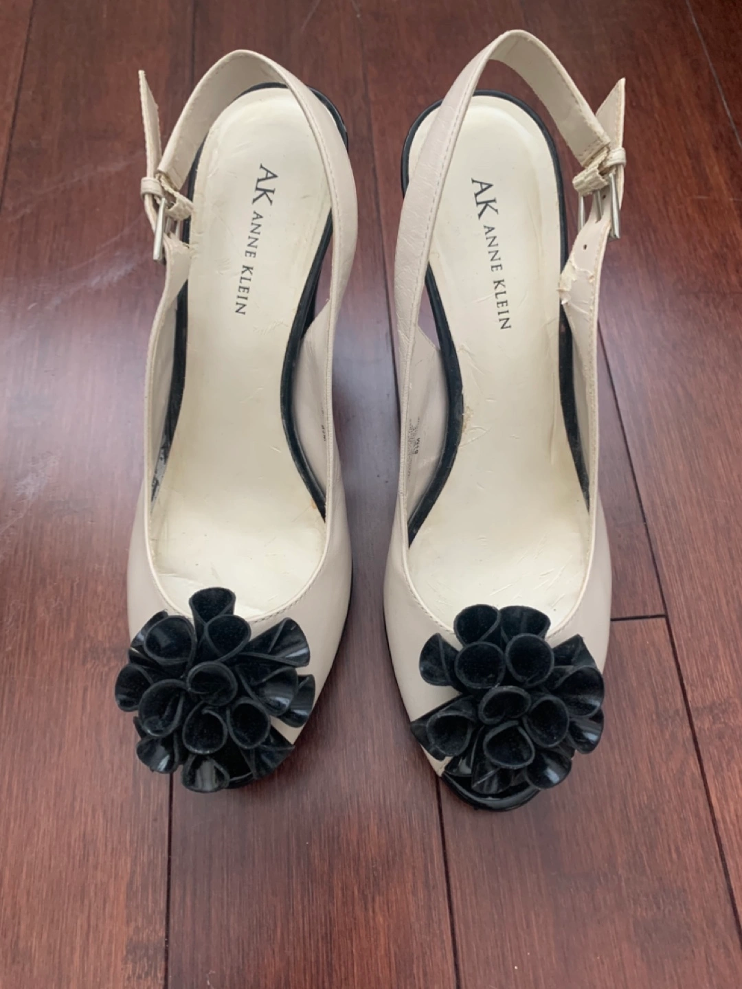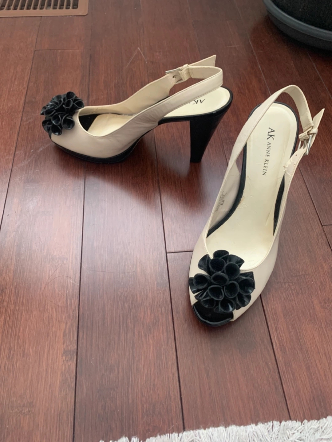 Cream coloured slingback heels. Black flower accents. Black heels. Size 8M. Very little wear.