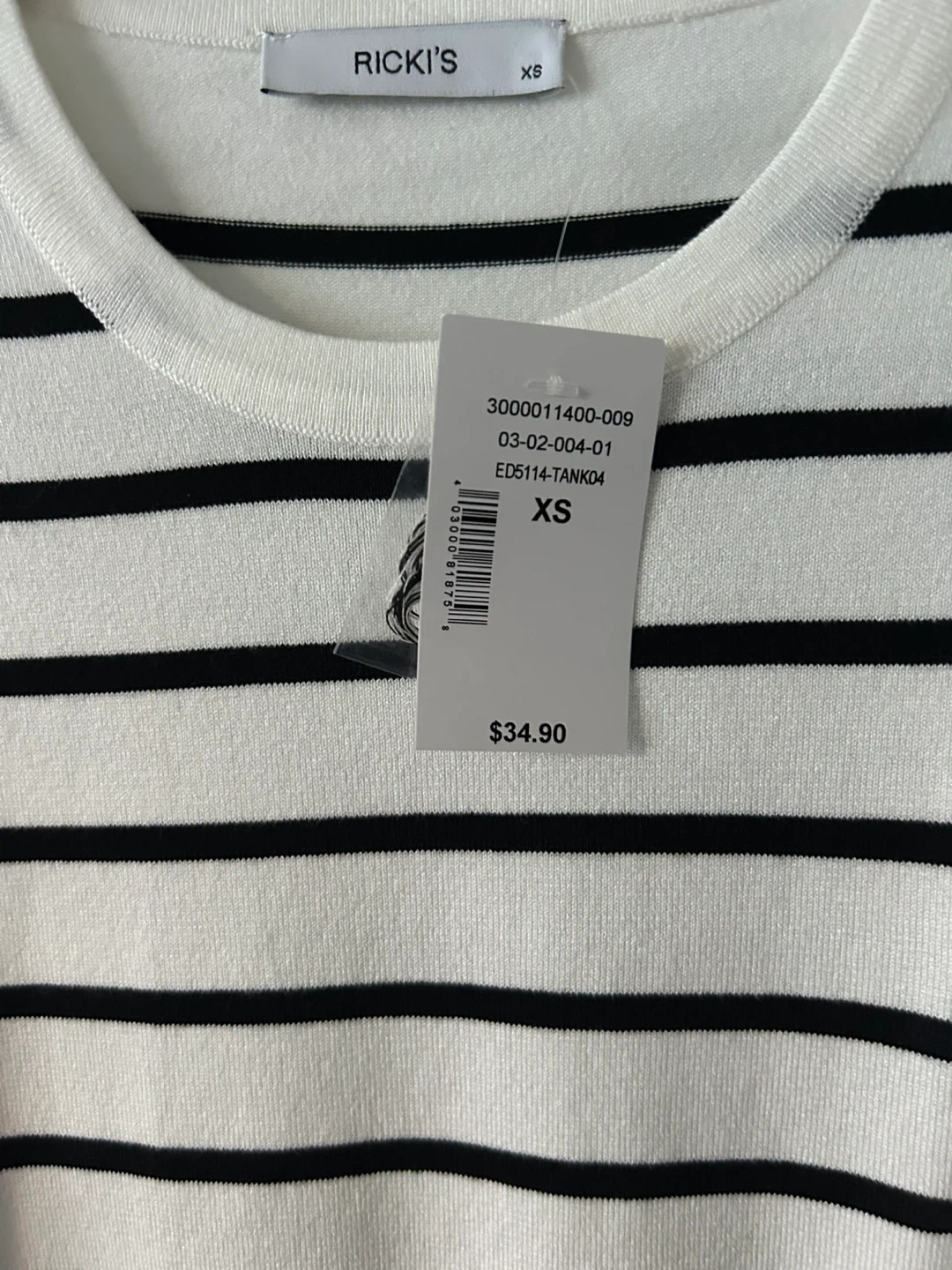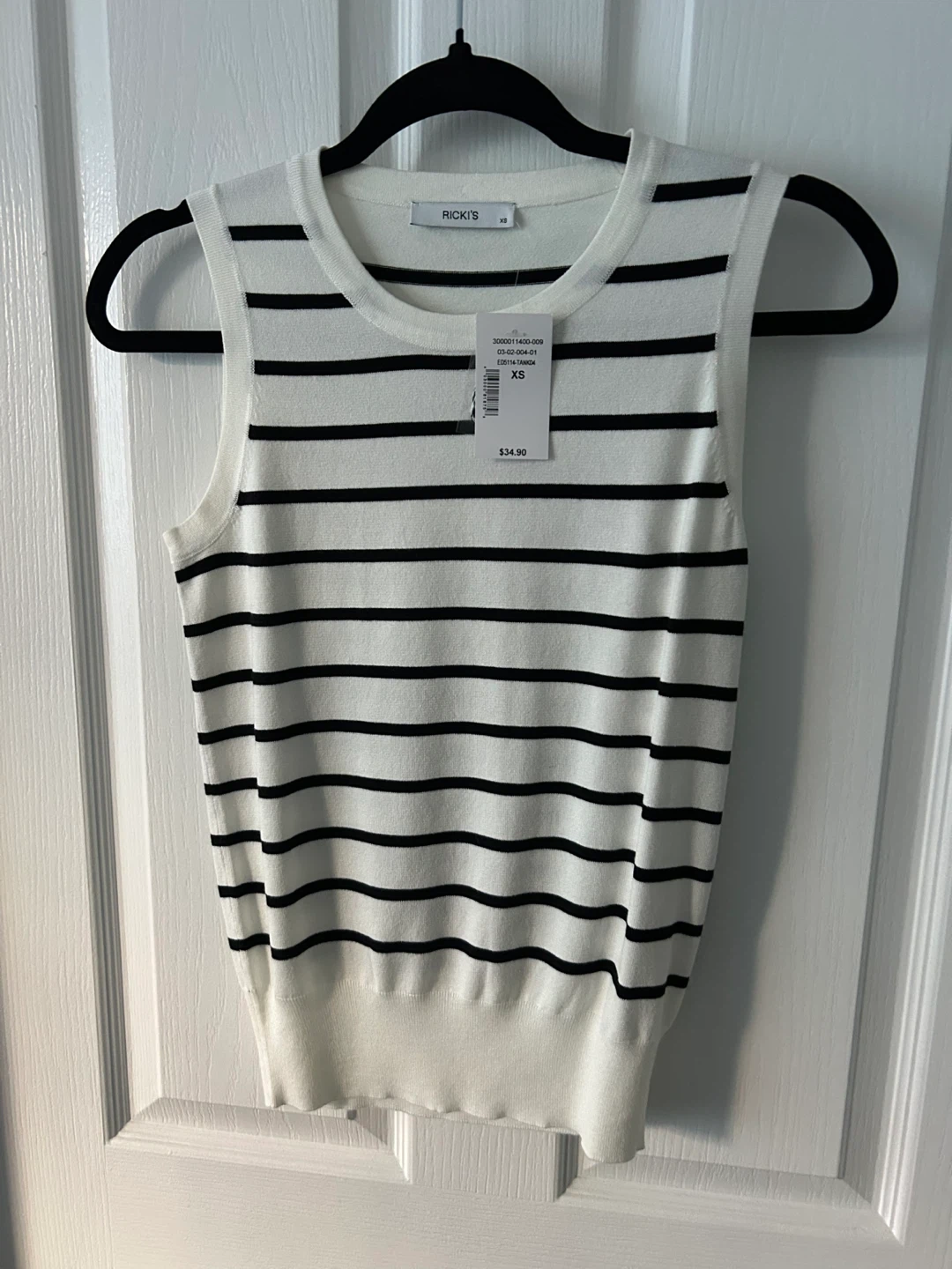 Ricki's sleeveless top with black and white stripes. It's a size XS. The material is a knit fabric. New with tags. Great for spring & summer, great for layering.