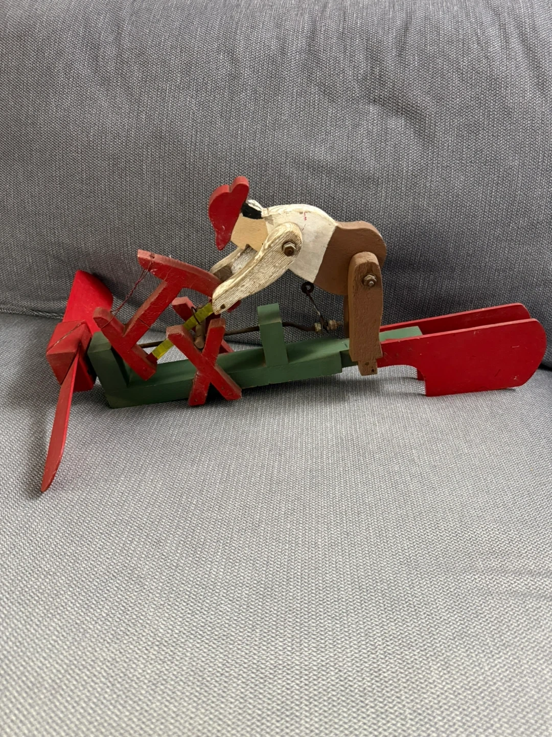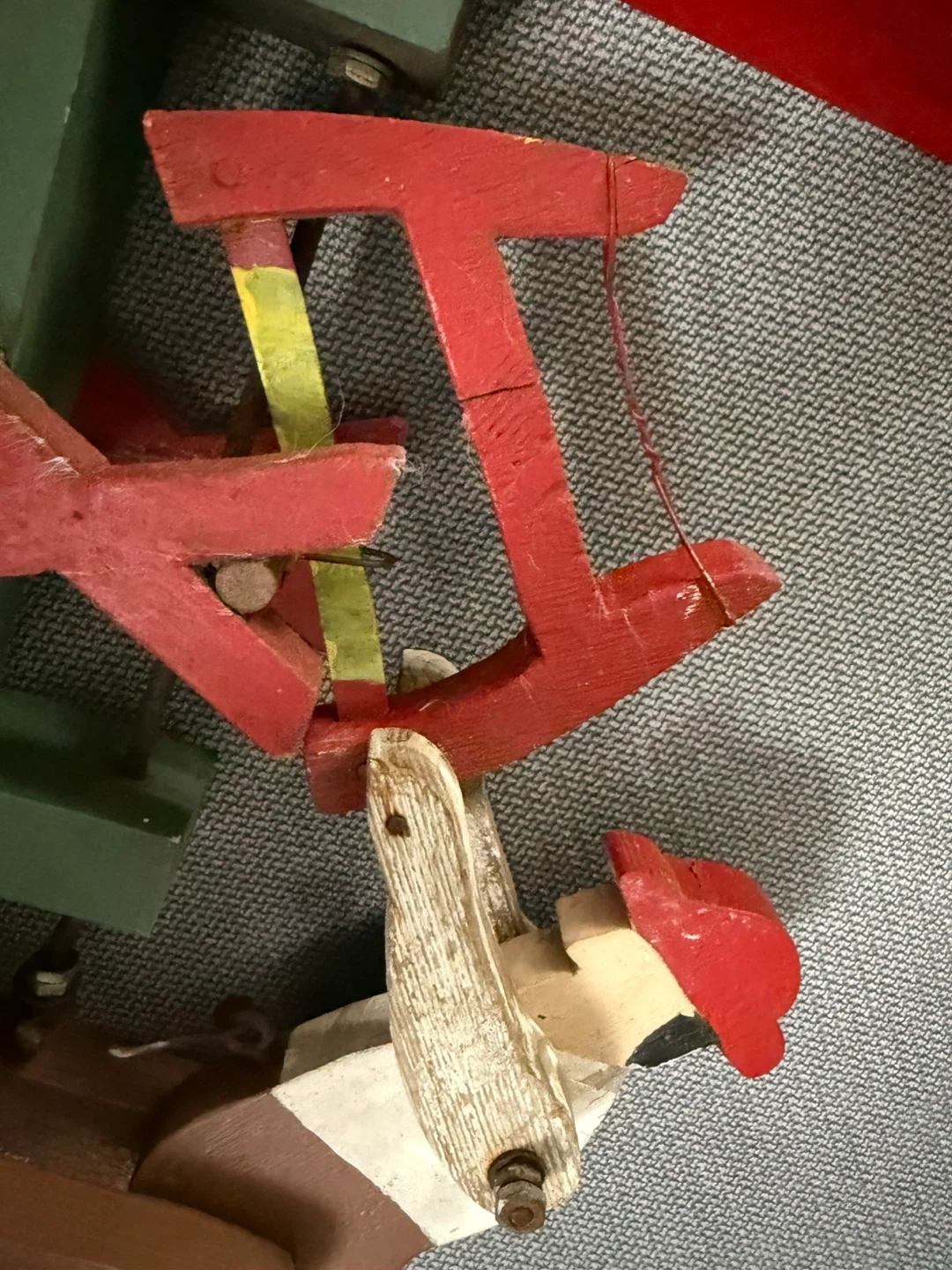 Two small mechanism pins are broken or missing. Despite this, the piece still moves and the mechanism operates when the propeller is turned. Replacing the pins may improve the stability of the mechanism.