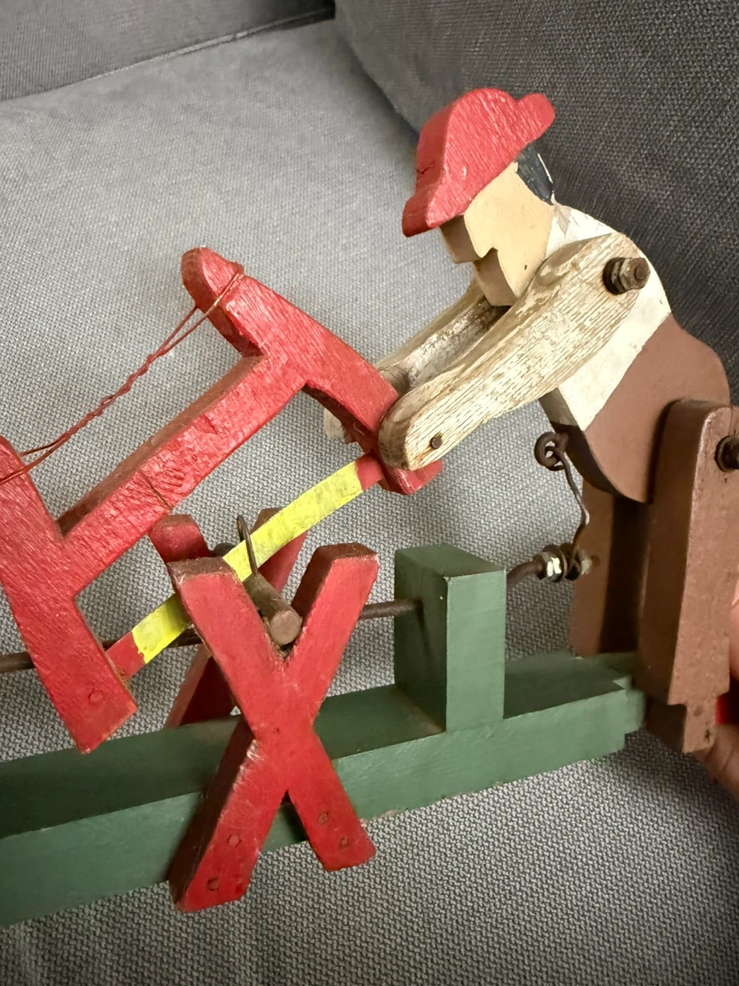 Vintage handmade wooden folk art mechanical toy / whirligig style figure of a man sawing wood.