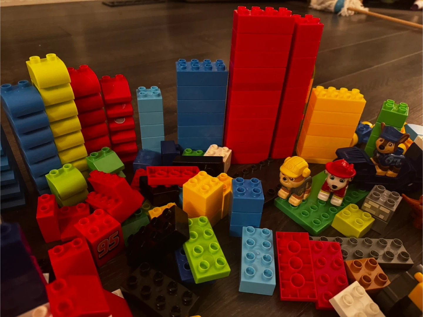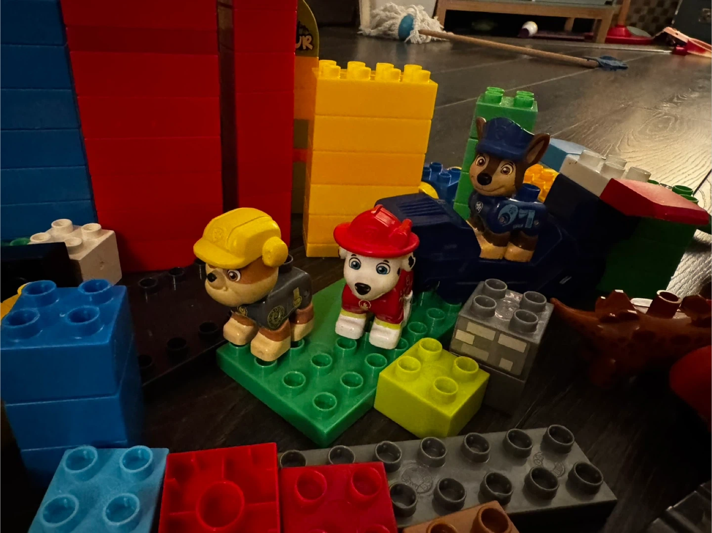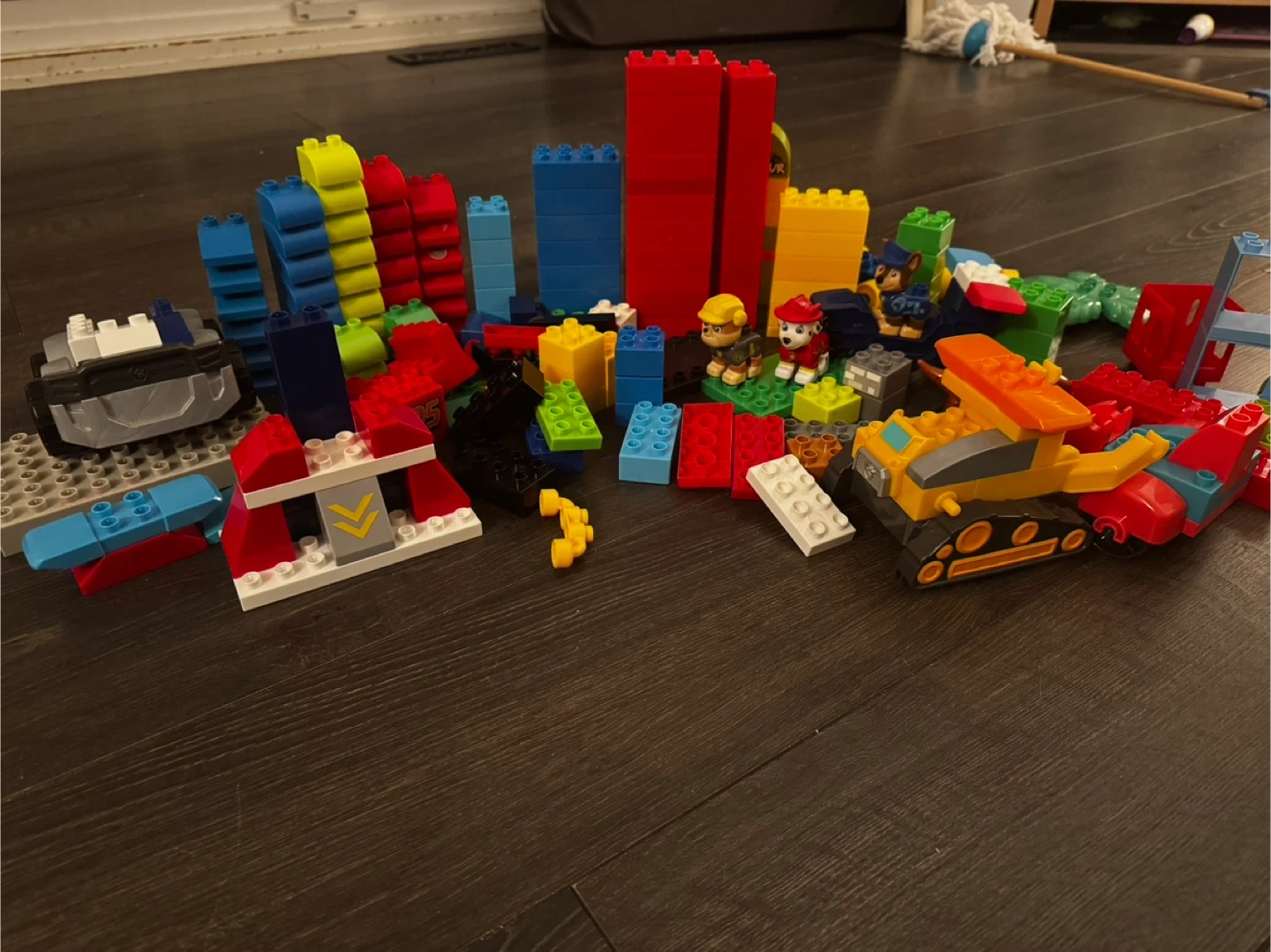 A random assortment of MEGA BLOKS building blocks and Paw Patrol figures. Includes various colourful bricks, accessories, and character pieces. These are great for imaginative play and building different structures!