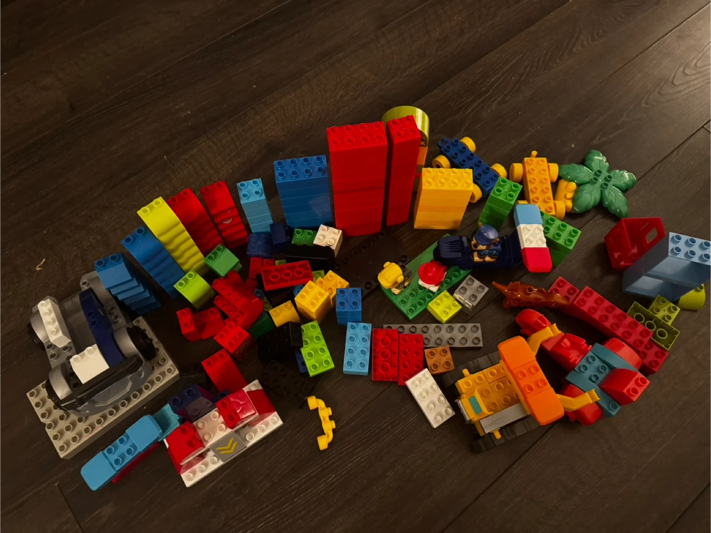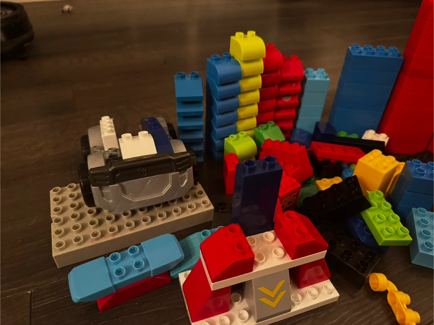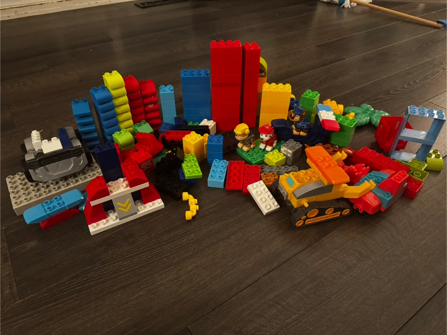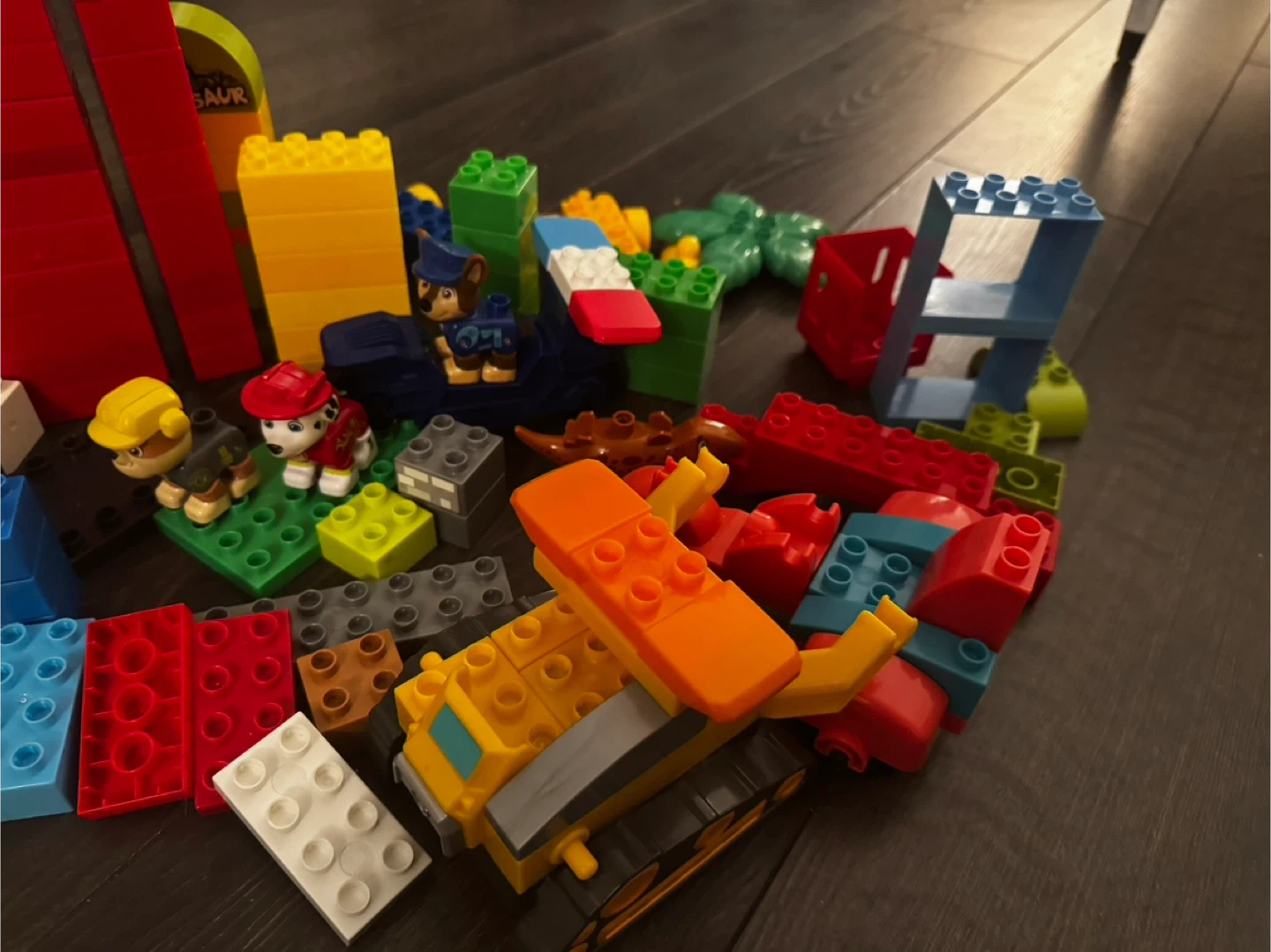 A random assortment of MEGA BLOKS building blocks and Paw Patrol figures. Includes various colourful bricks, accessories, and character pieces. These are great for imaginative play and building different structures!
