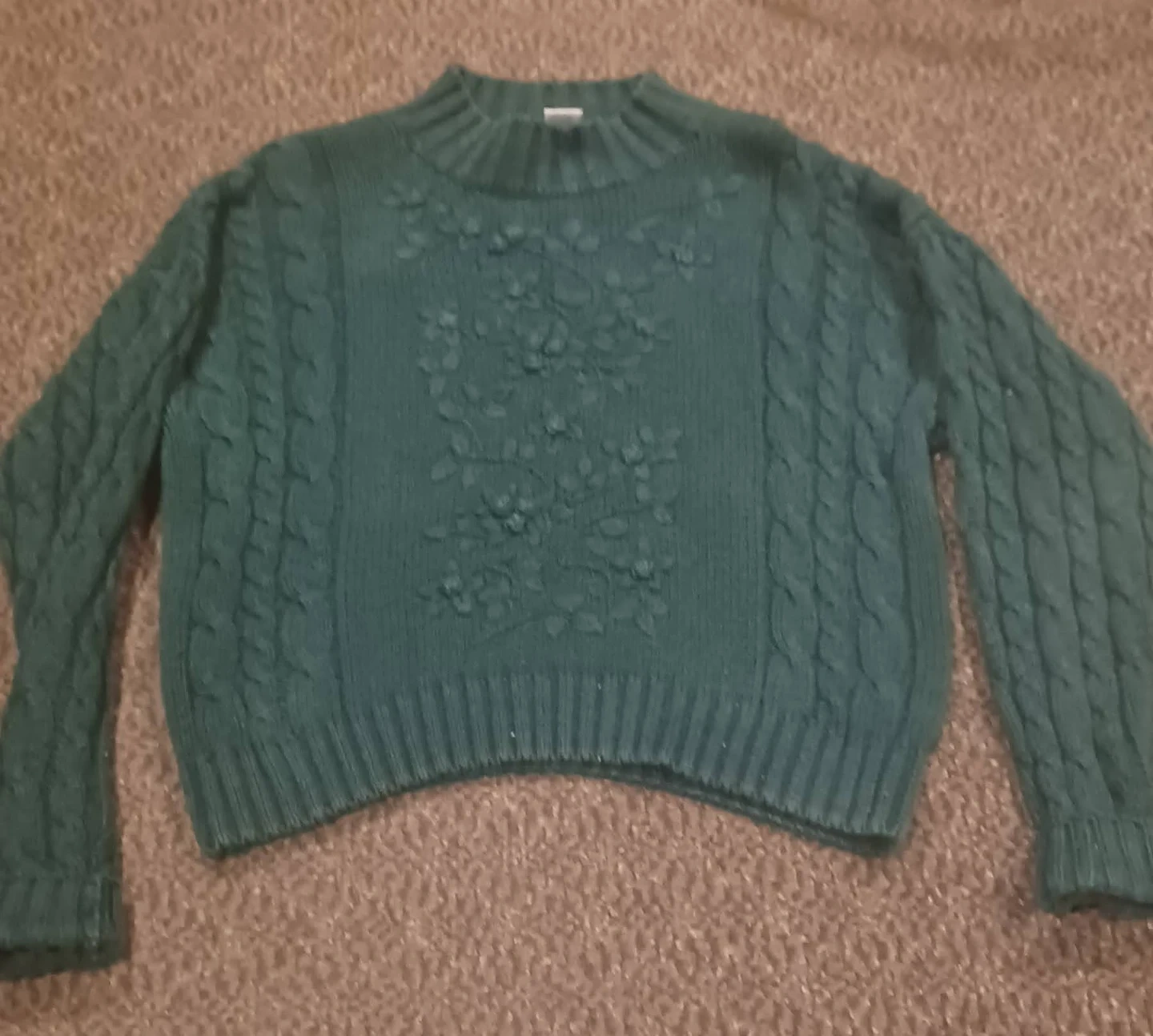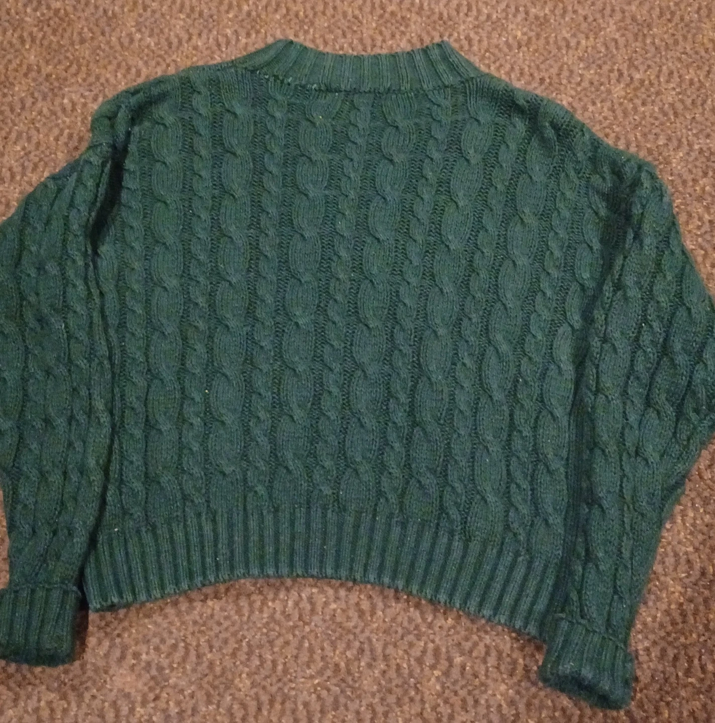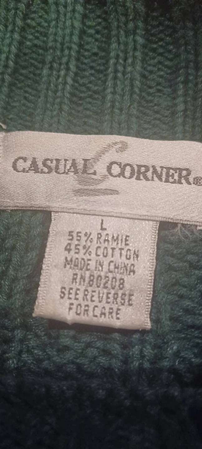 This is a used, but in good condition, Casual Corner green cable knit sweater, size large, made of 55% ramie and 45% cotton. It is perfect for adding a touch of warmth and style to any outfit.