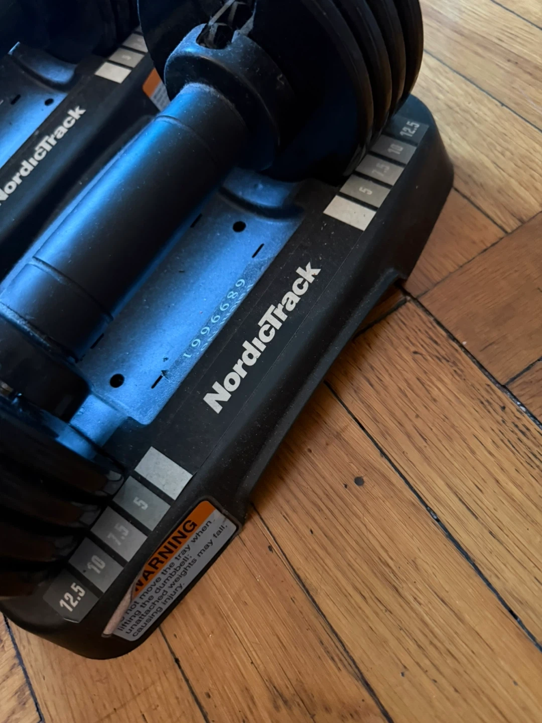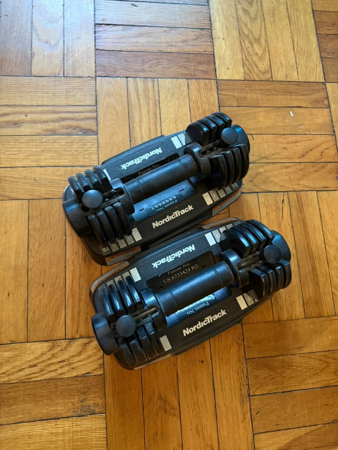 These NordicTrack adjustable dumbbells offer a convenient way to switch weights quickly. Each dumbbell adjusts from 5 lbs up to 12.5 lbs in 2.5 lb increments. Adjusting the weight is simple with the twist-lock mechanism. It's great for strength training at home!