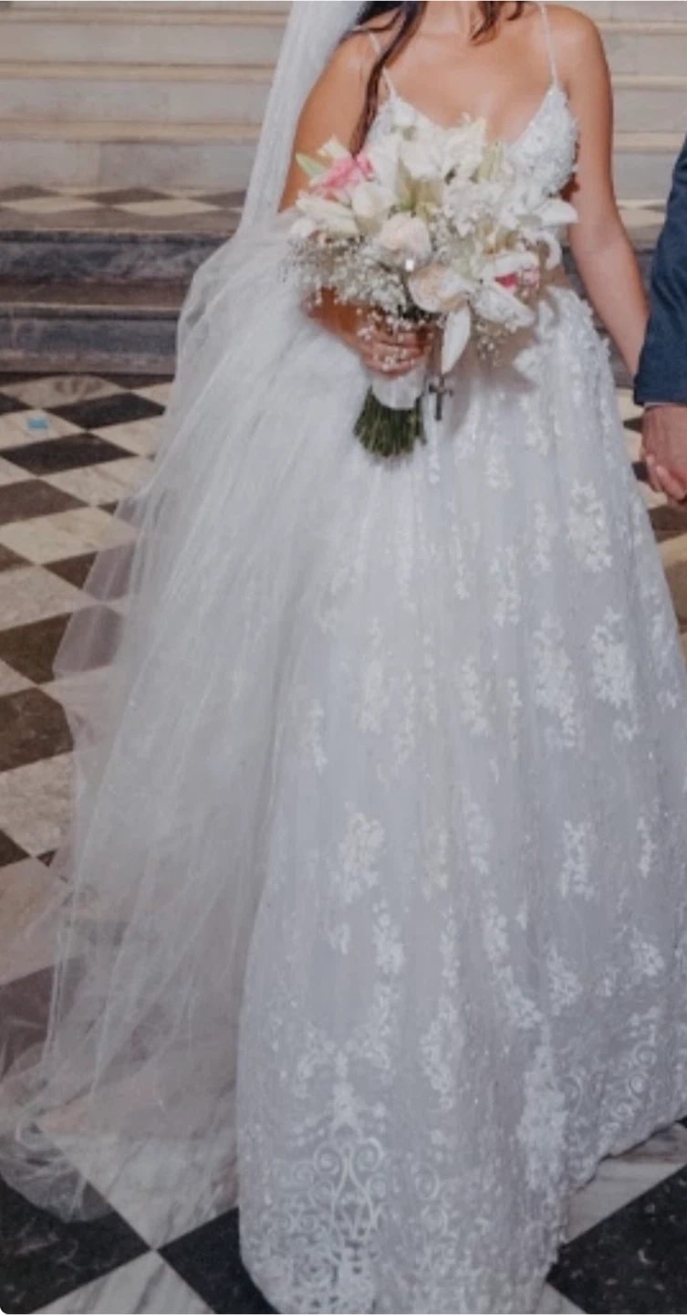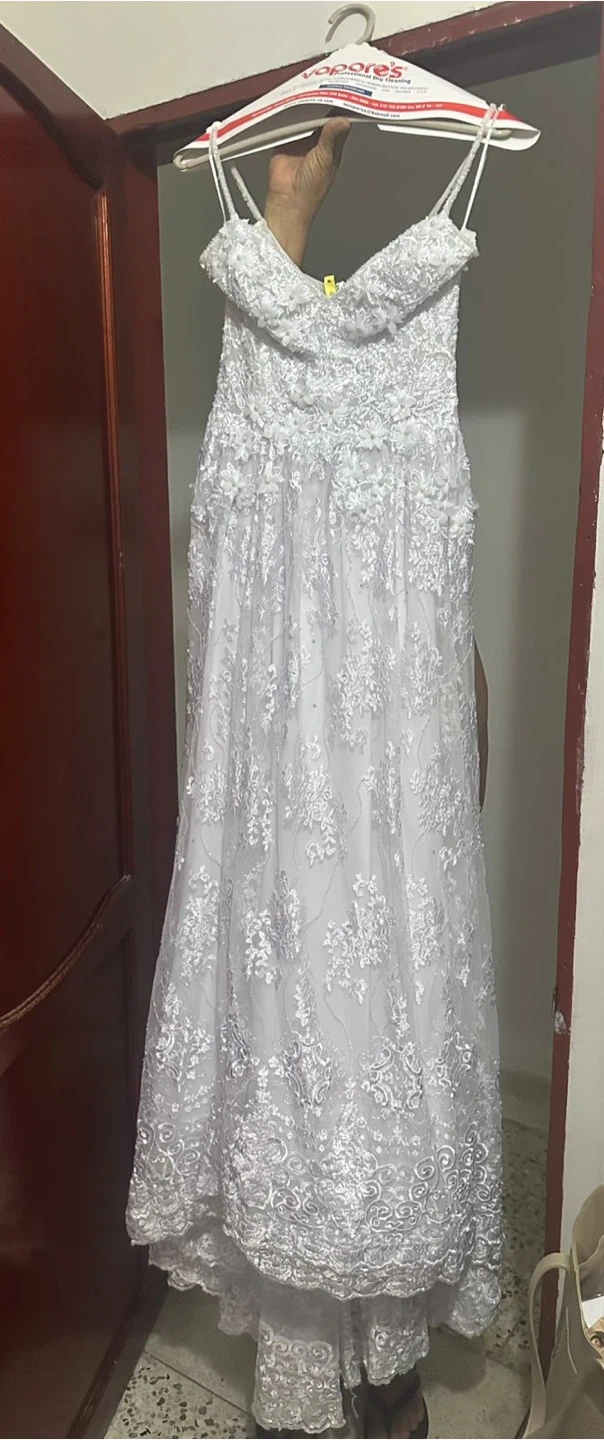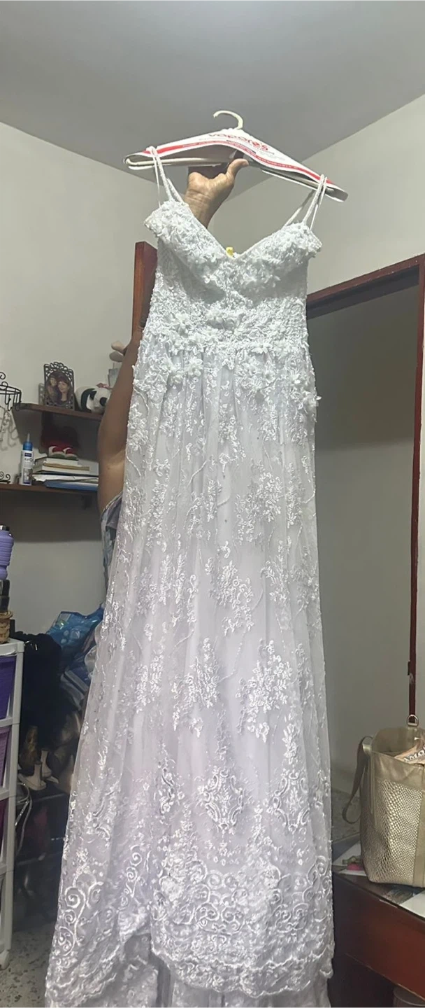 Beautiful white lace wedding dress. Handmade de by a Colombian designer. Features delicate lace appliques and a flattering silhouette. Comes with spaghetti straps and a full skirt. Perfect for your special day!