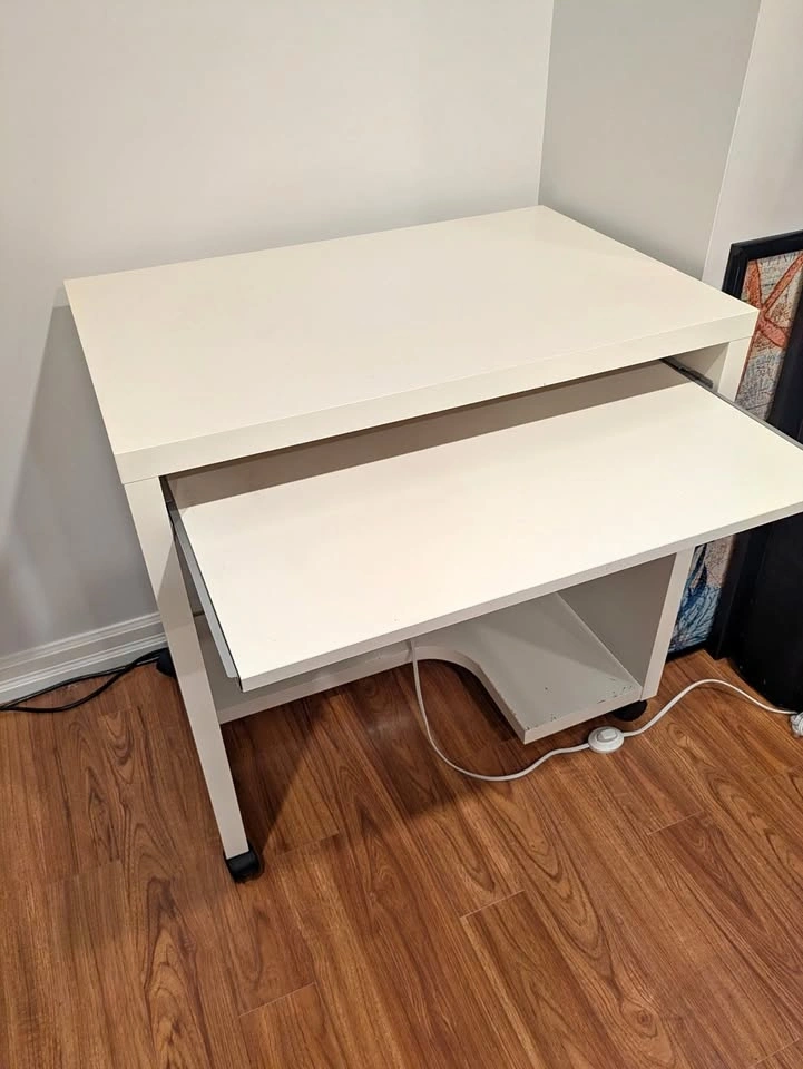 Moving sale. Small computer desk with movable wheels and pull-out keyboard tray. 77Wx50Dx76Hcm. Keyboard tray pulled out is 80cm depth. Used with some scratches on the paint. If the ad is up, it is available. Pick up Mississauga West End.