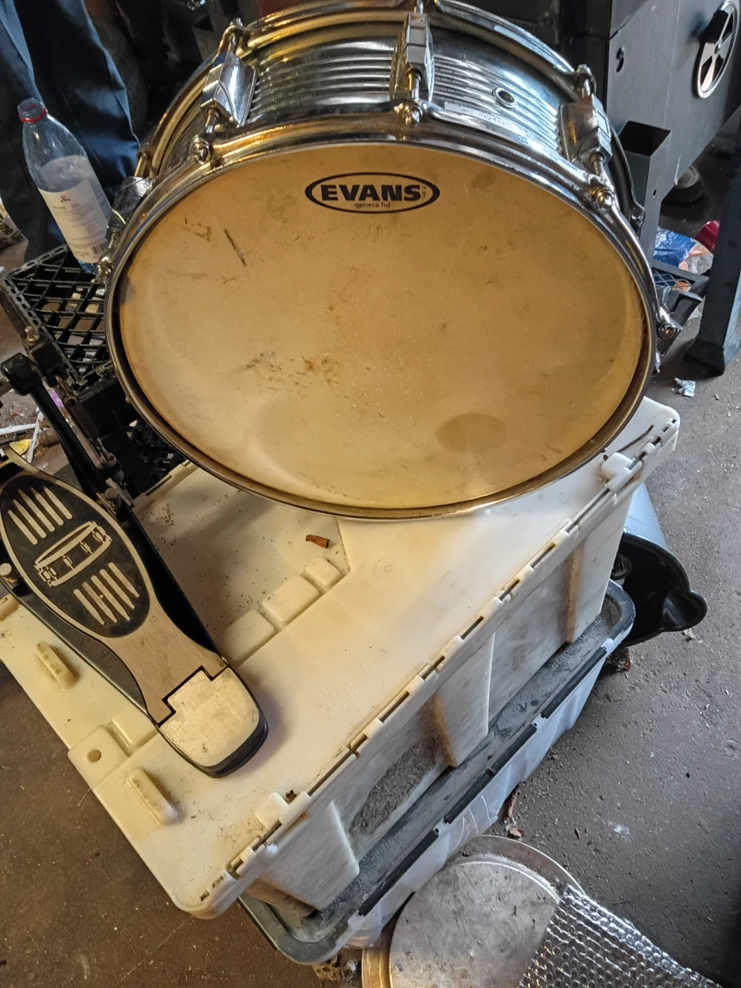 Snare drum head with Evans Genera HD branding. Includes a bass drum pedal. Ready for your next jam session!