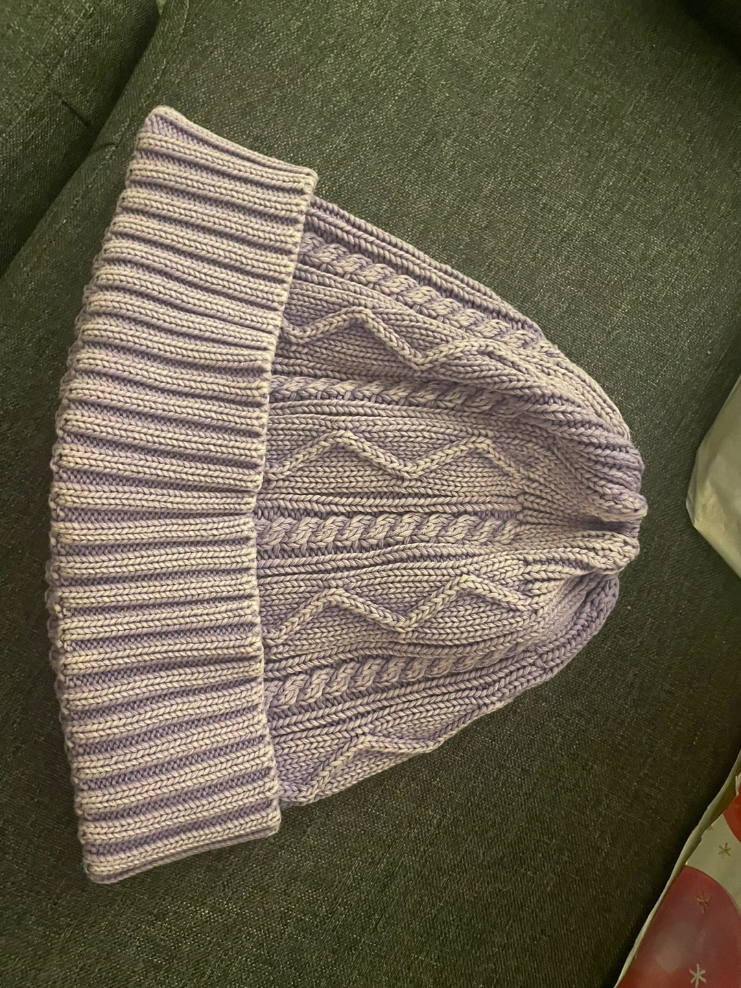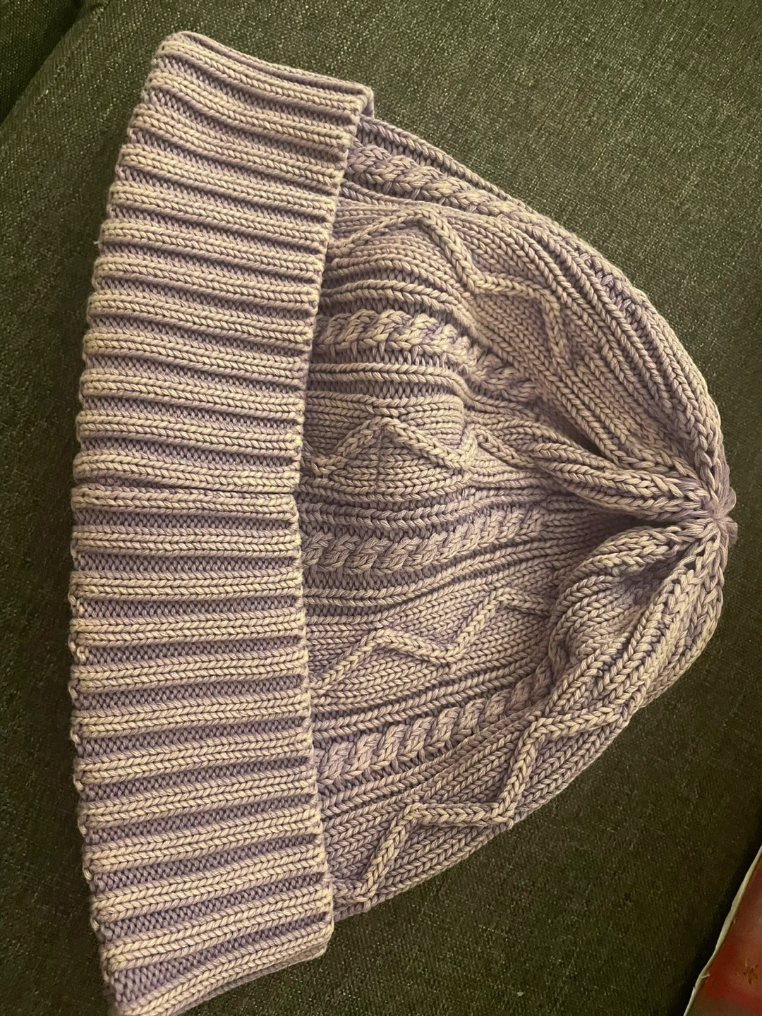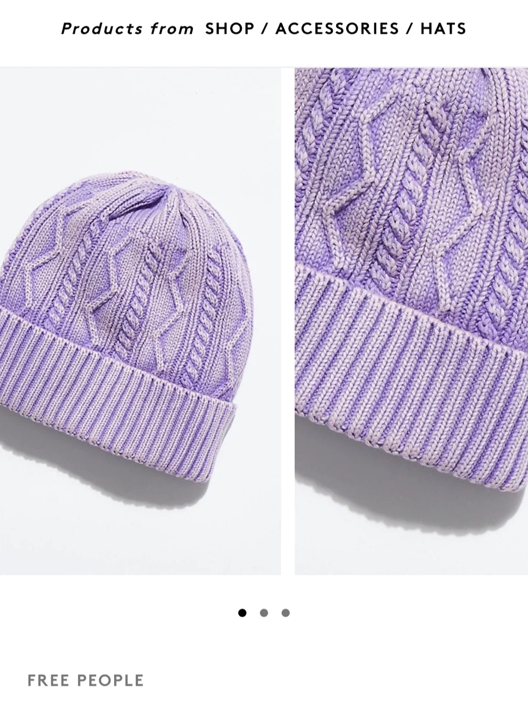 This Free People beanie features a classic cable knit pattern and a ribbed cuff. It's a cozy, stylish accessory for cooler weather. The lavender colour is unique and eye-catching. It's made from a soft, knit material.