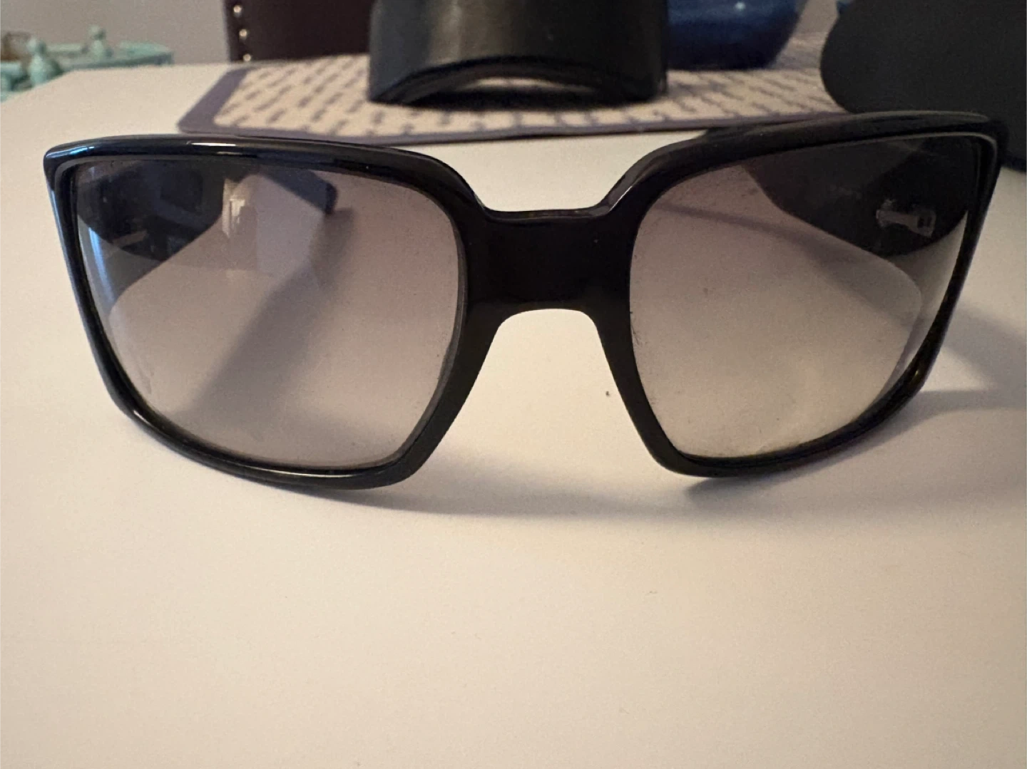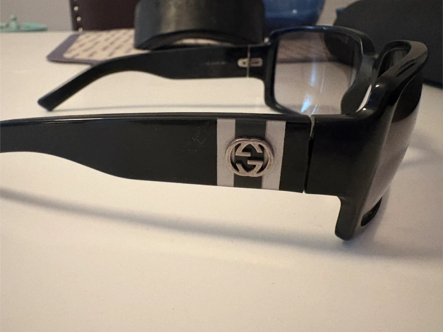Chic black Gucci sunglasses with a stylish square frame. Features the iconic interlocking G logo on the temples. These shades offer a fashionable look for sunny days!