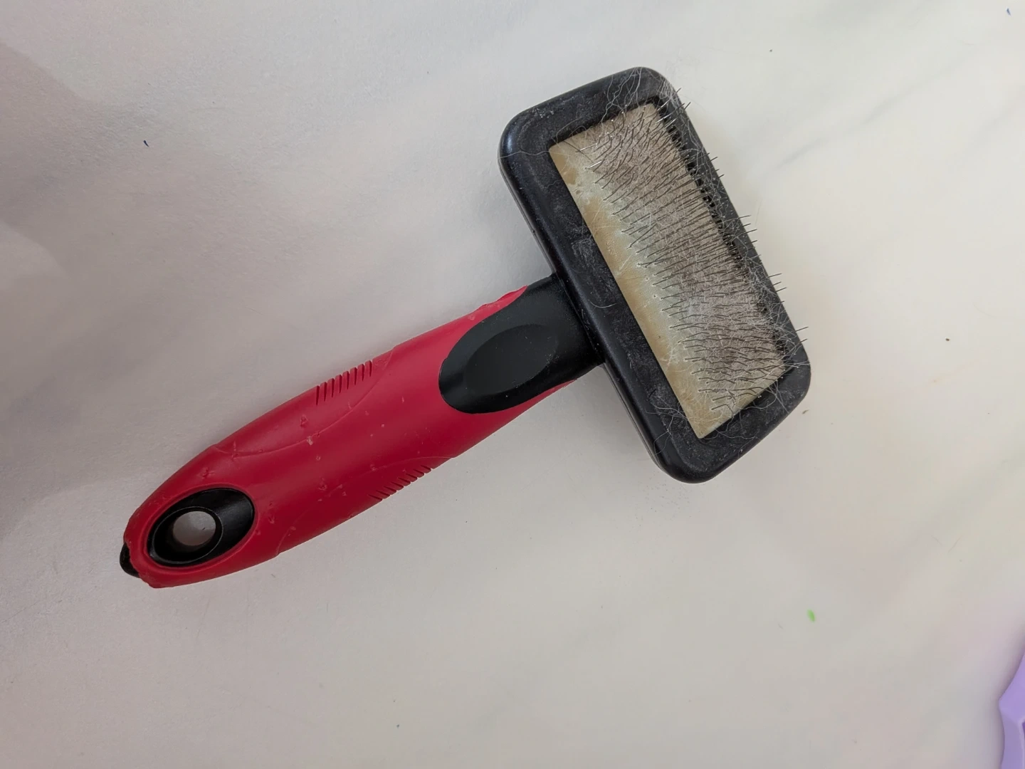 This is a pet grooming slicker brush with a red handle and black accents. It's designed for deshedding and detangling fur. The brush has fine, angled bristles that penetrate the coat effectively.