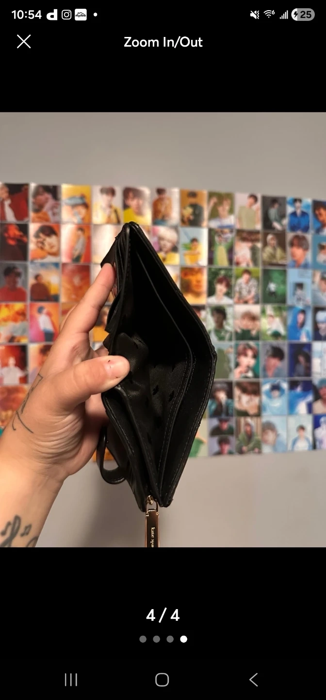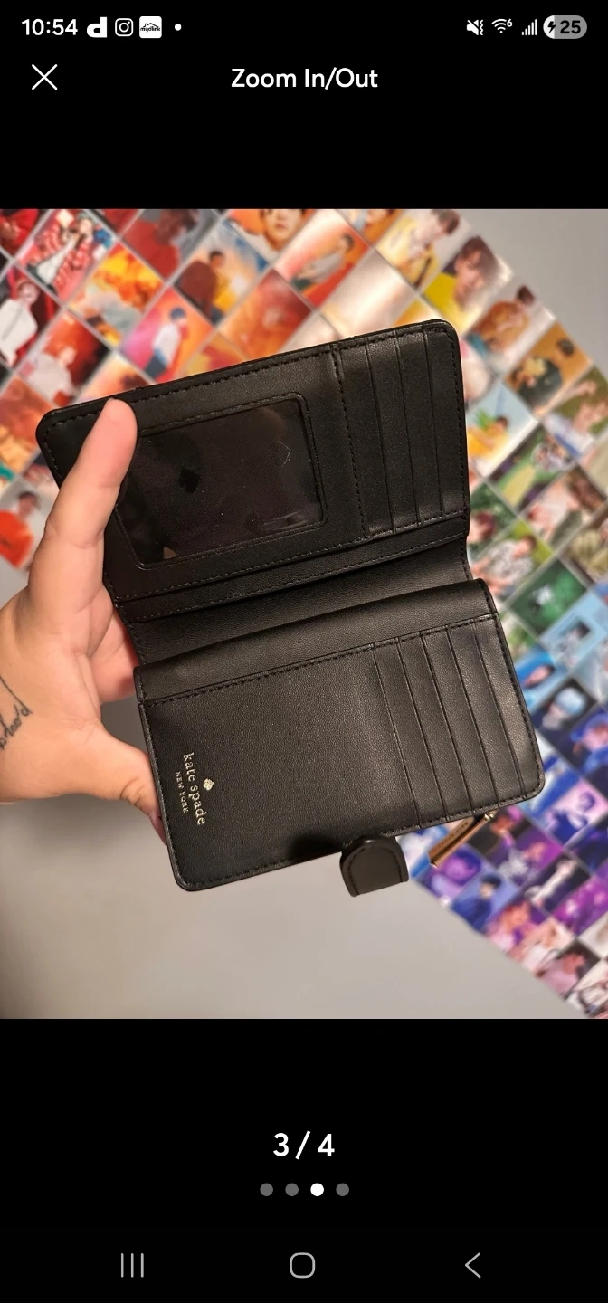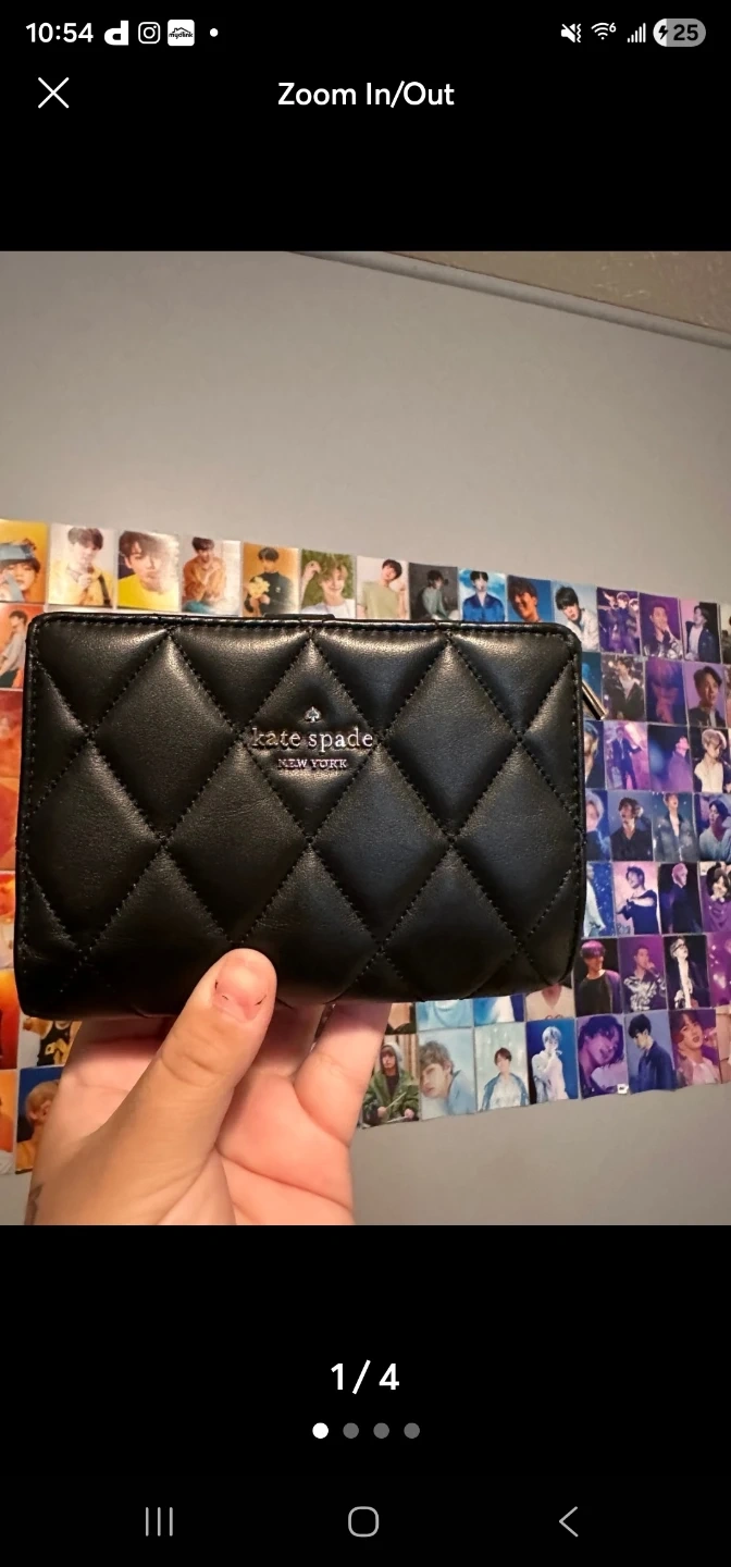 This is a Kate Spade bi-fold wallet. It's black with a quilted exterior. Includes multiple card slots and a clear ID window.