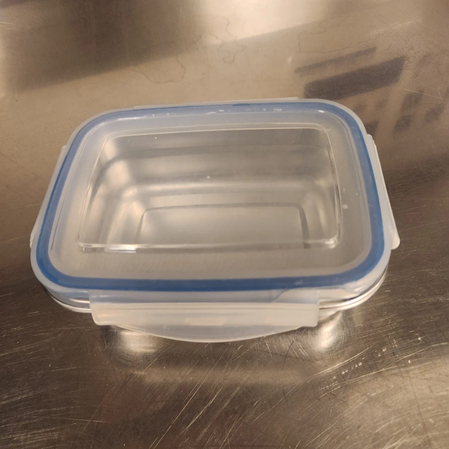 This food storage container is made of stainless steel with a clear plastic lid. The lid features a blue silicone seal and four locking clasps for an airtight seal. It's a handy size for lunches or leftovers. Keep your food fresh with this durable container!