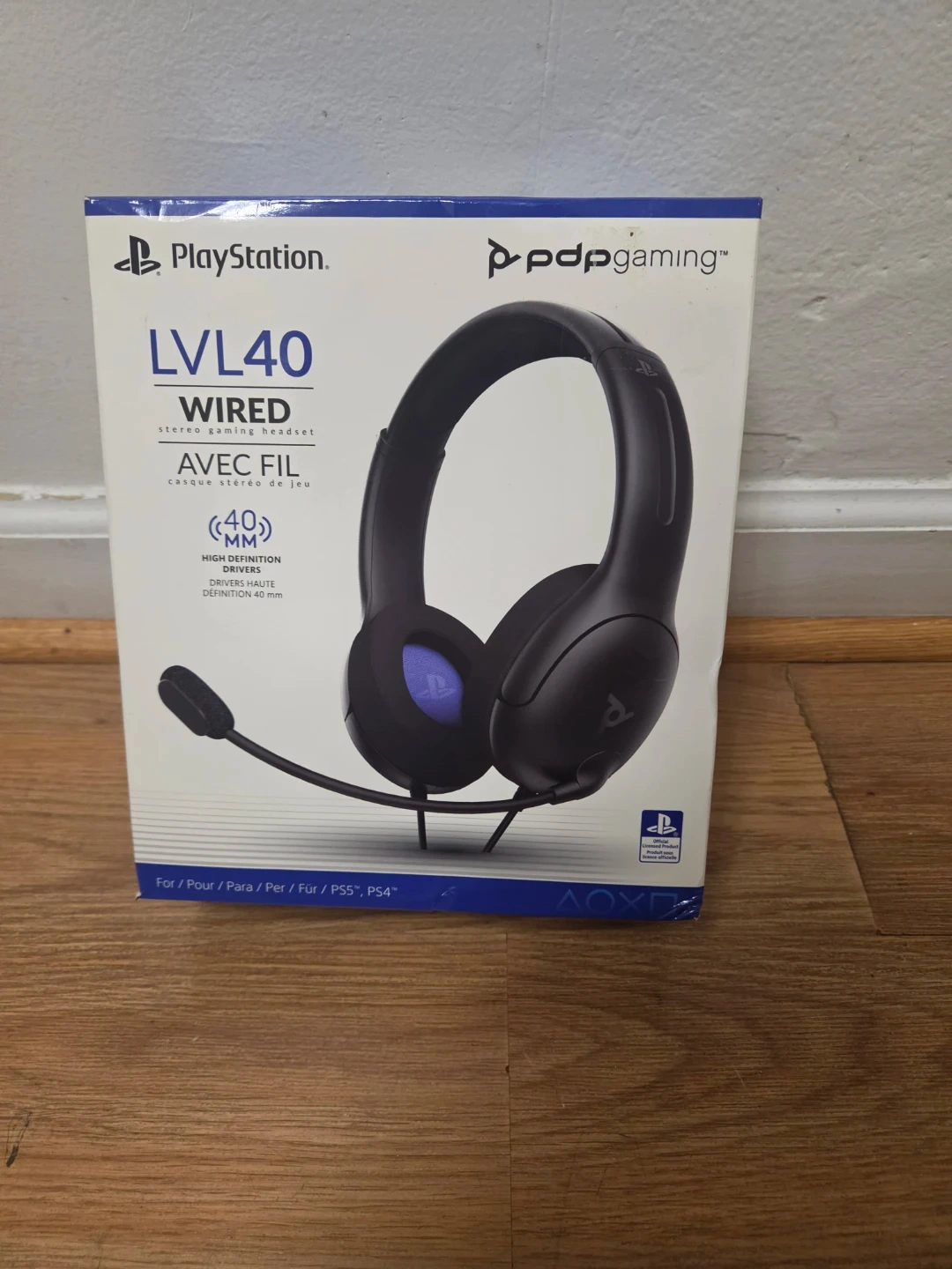 This is a PDP Gaming LVL40 wired stereo gaming headset. It features 40mm high-definition drivers for clear audio. The headset includes a boom microphone and is compatible with PS5 and PS4 consoles.