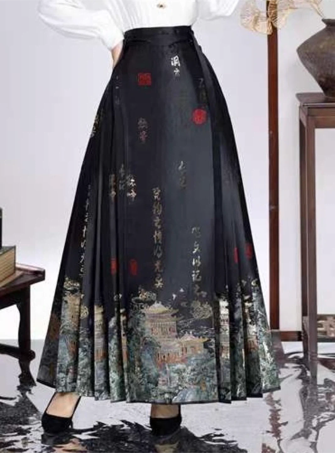 Beautifully designed pleated maxi skirt with a traditional Chinese landscape print. It features a high waist and a flowy A-line silhouette. This skirt's unique pattern makes it a statement piece for any occasion. It's perfect for cultural events or adding an artistic touch to your wardrobe.