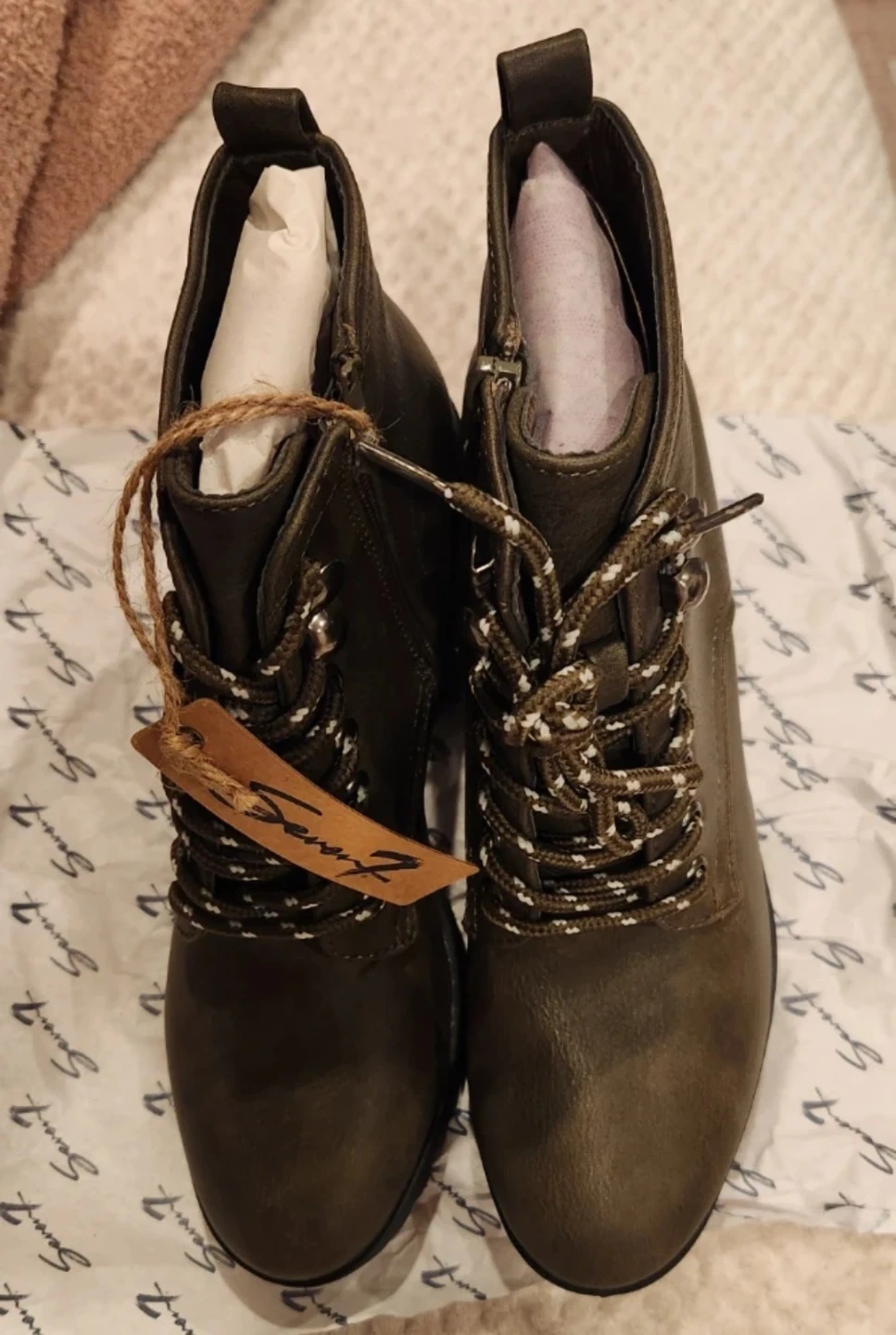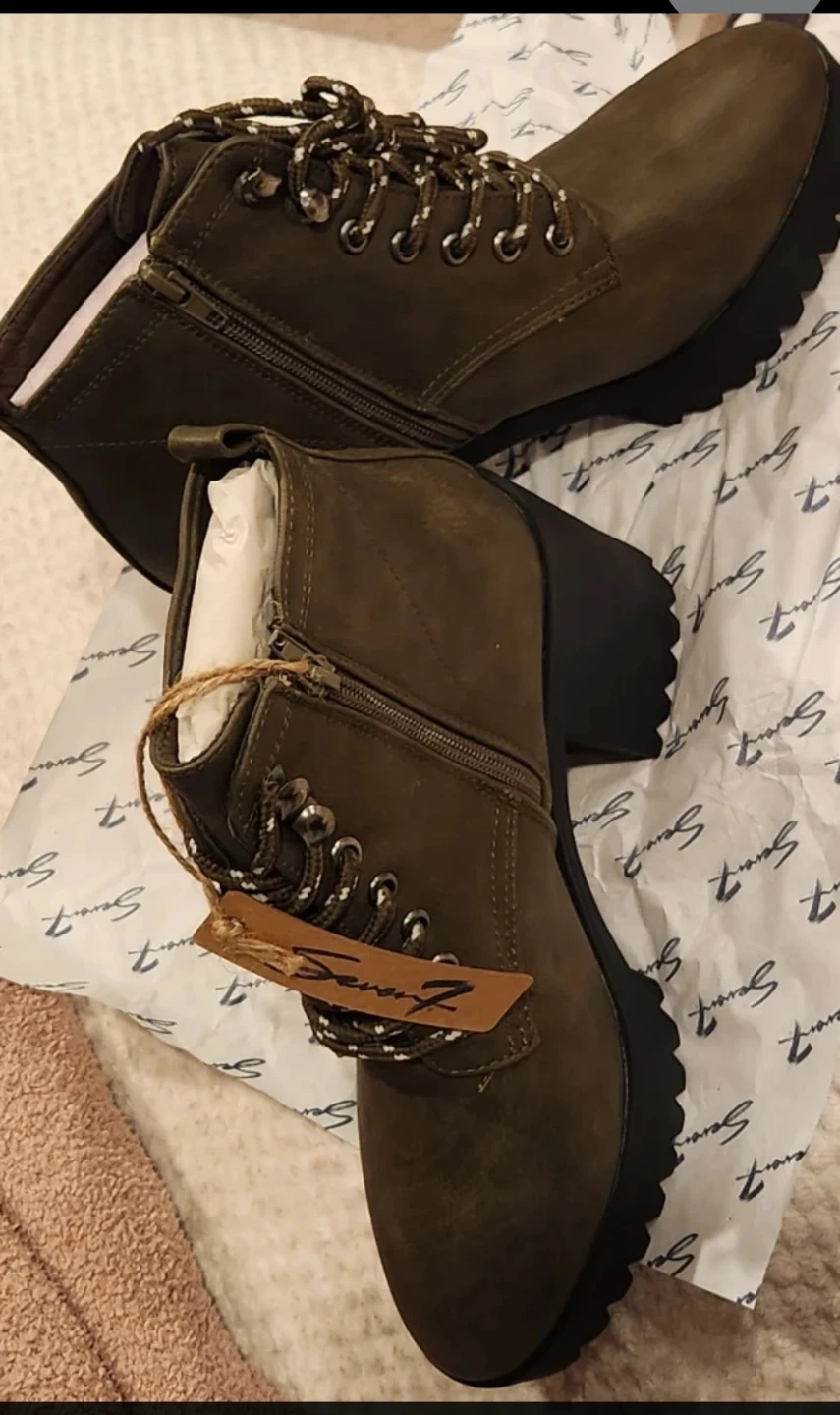 These Seven7 combat boots are a stylish olive green color. They feature a lace-up front and side zipper for easy on and off. The lug sole provides good traction. This is a pair of Seven7 Flatiron Lug Sole Boots, soft vegan leather material. (IF INTERESTED, I MAY HAVE OTHERS IN DIFFERENT SIZES)