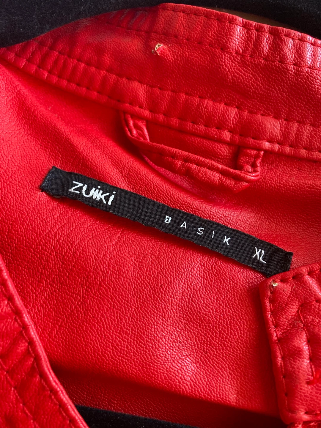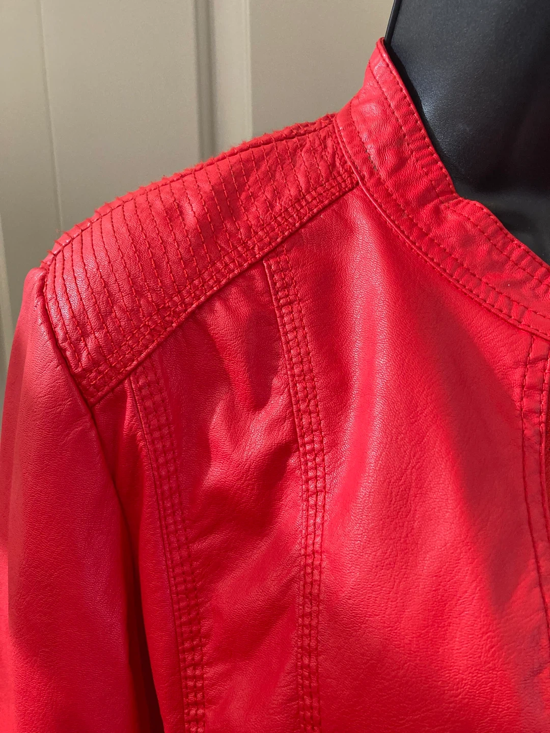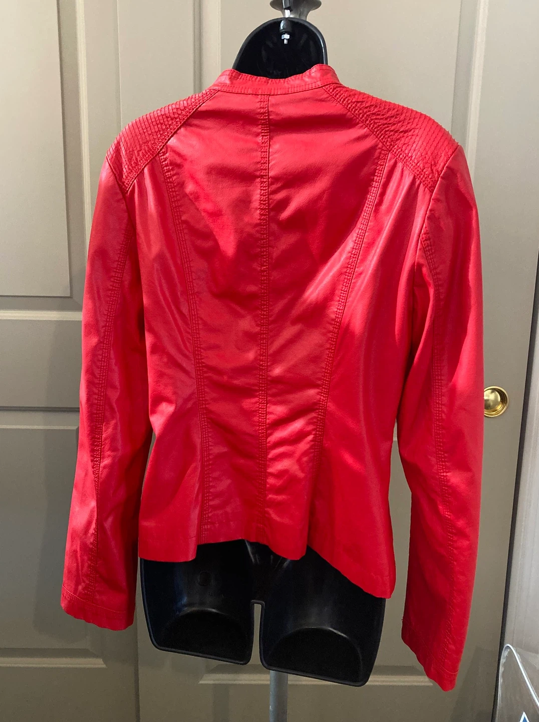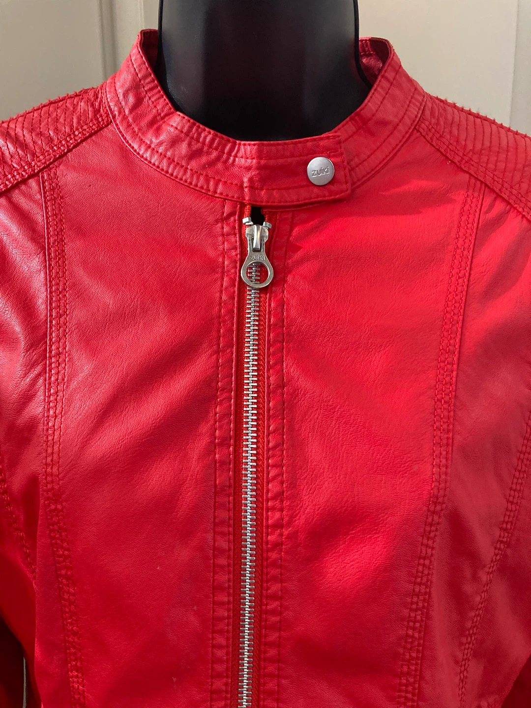 65Here's a stylish red faux leather moto jacket from Zuiki! It's perfect for adding a pop of color to any outfit. Purchased in Italy. Marked XL but truly a women’s Medium.