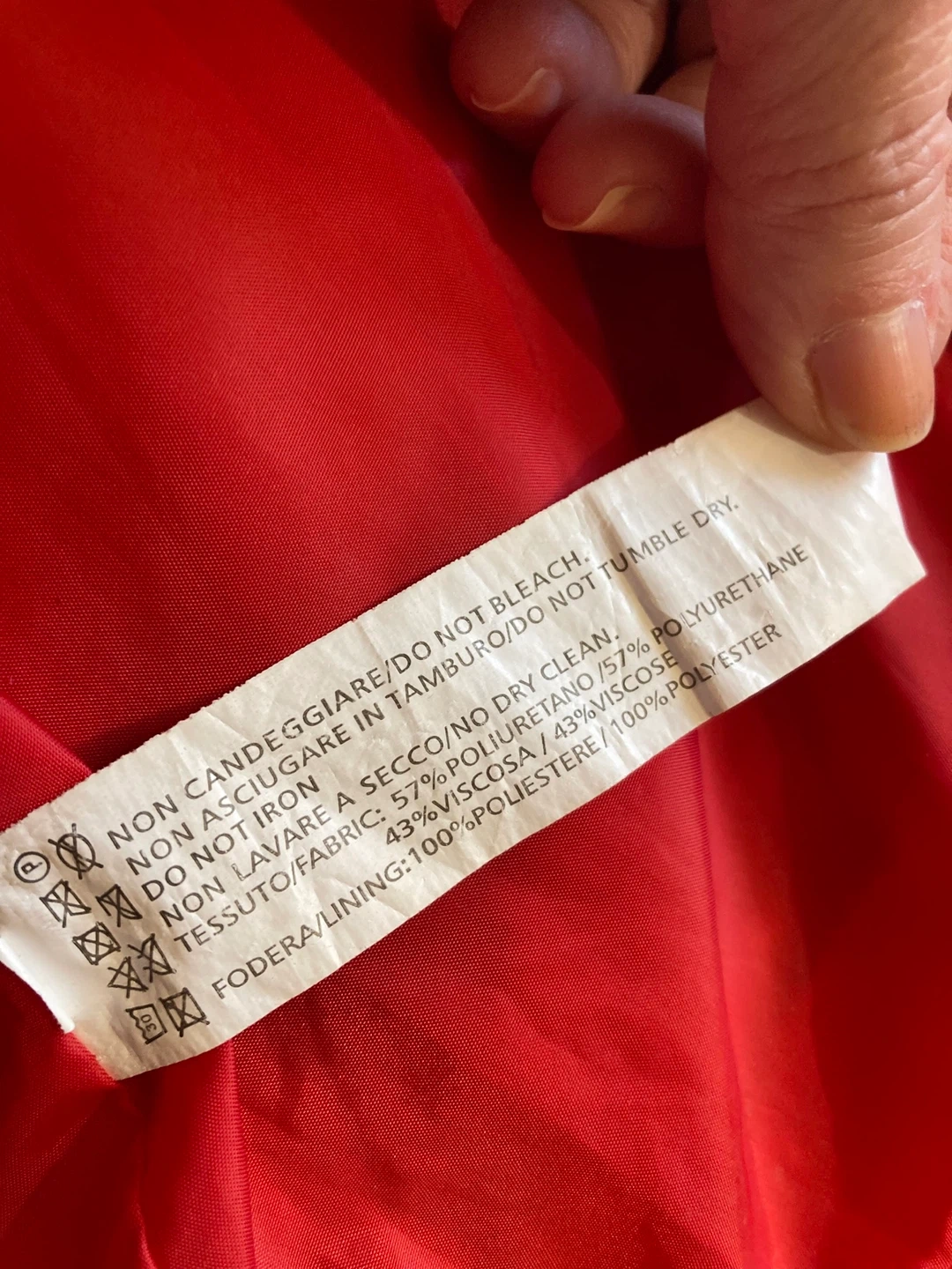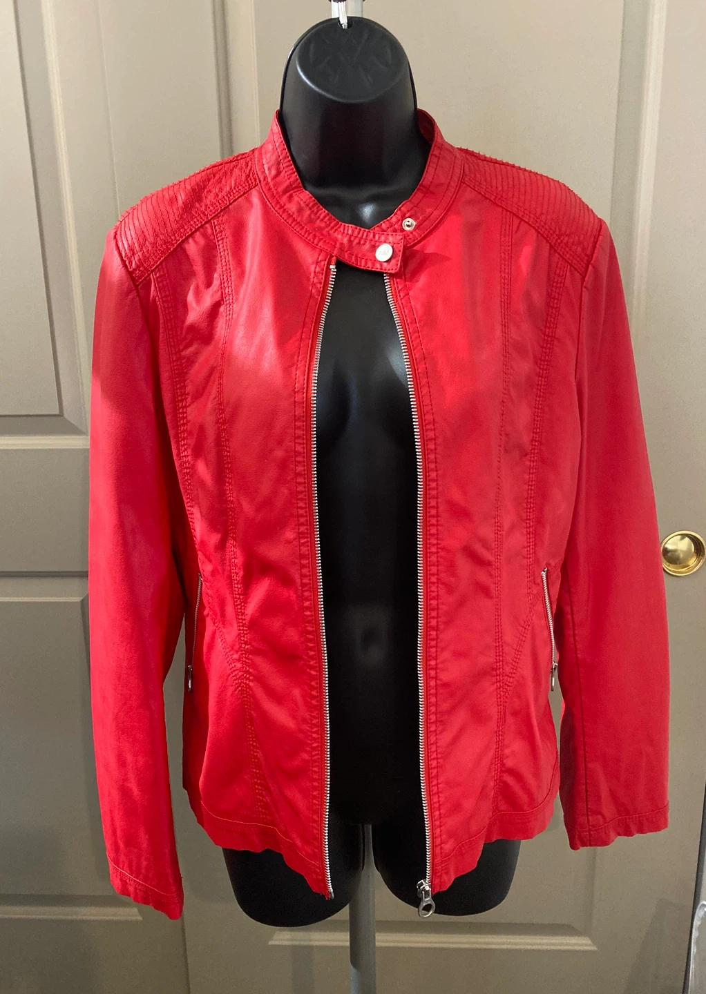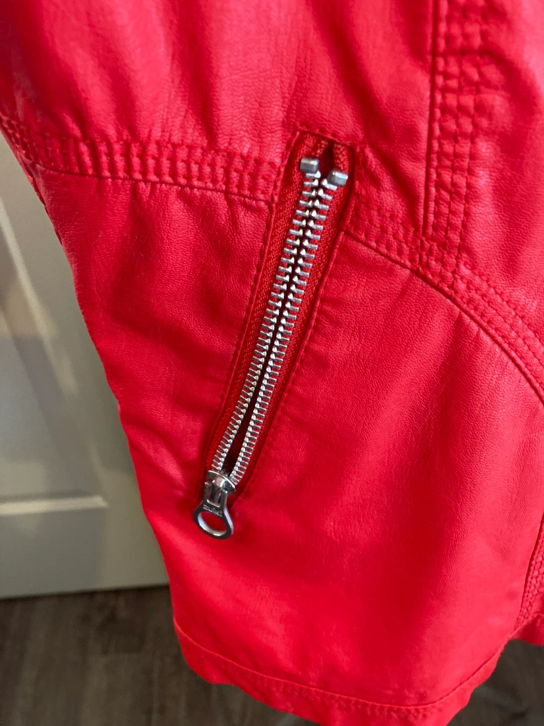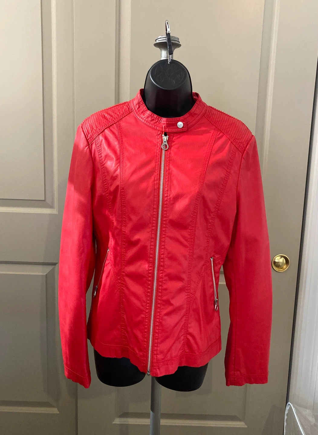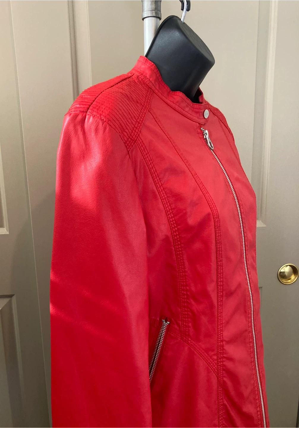 65Here's a stylish red faux leather moto jacket from Zuiki! It's perfect for adding a pop of color to any outfit. Purchased in Italy. Marked XL but truly a women’s Medium.