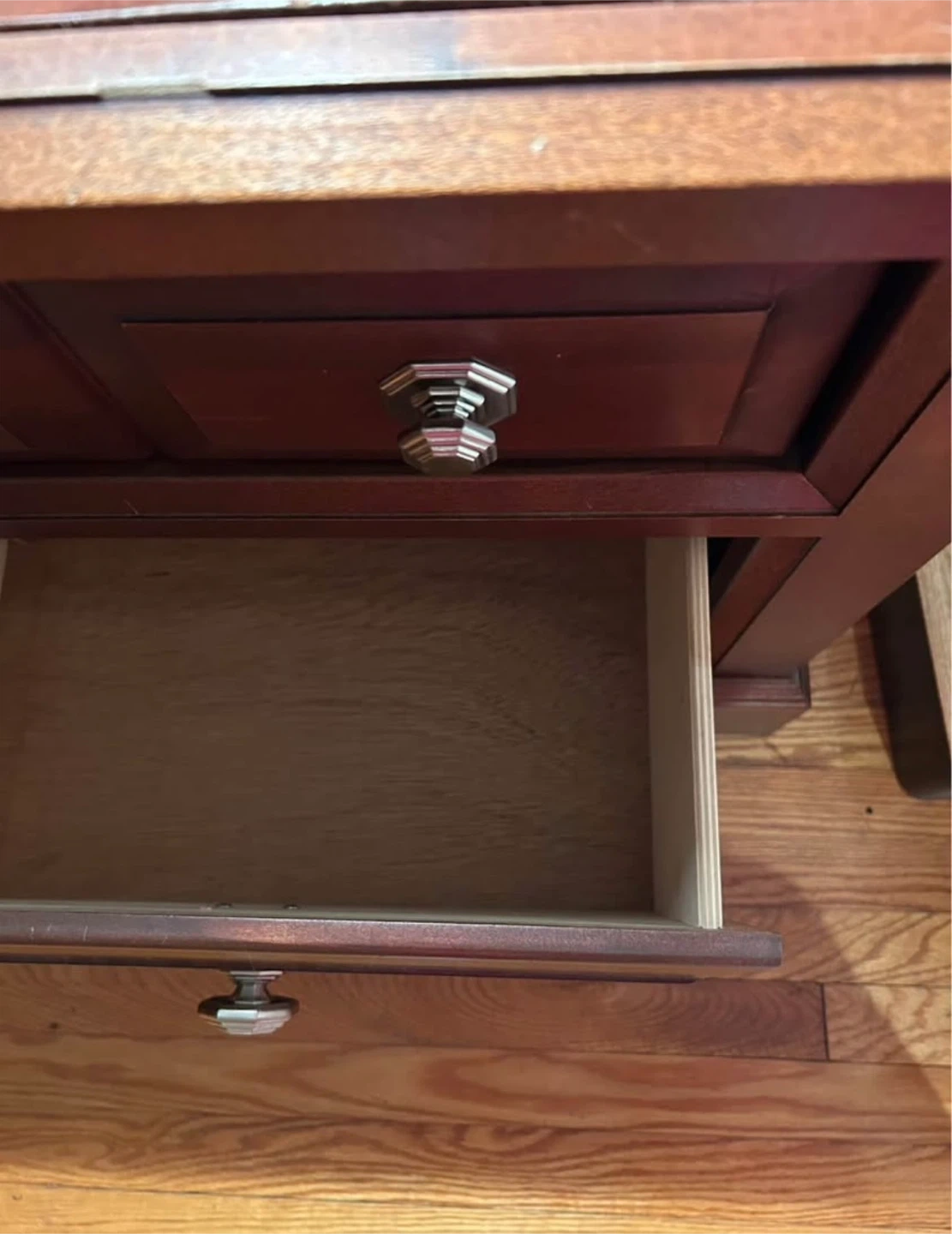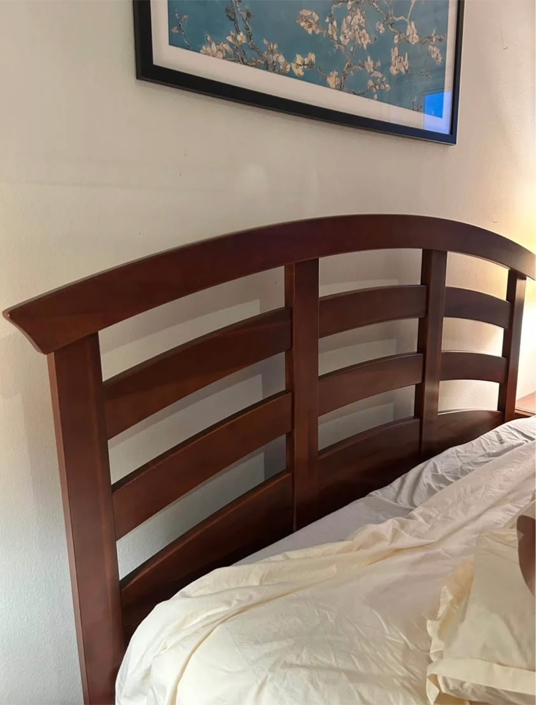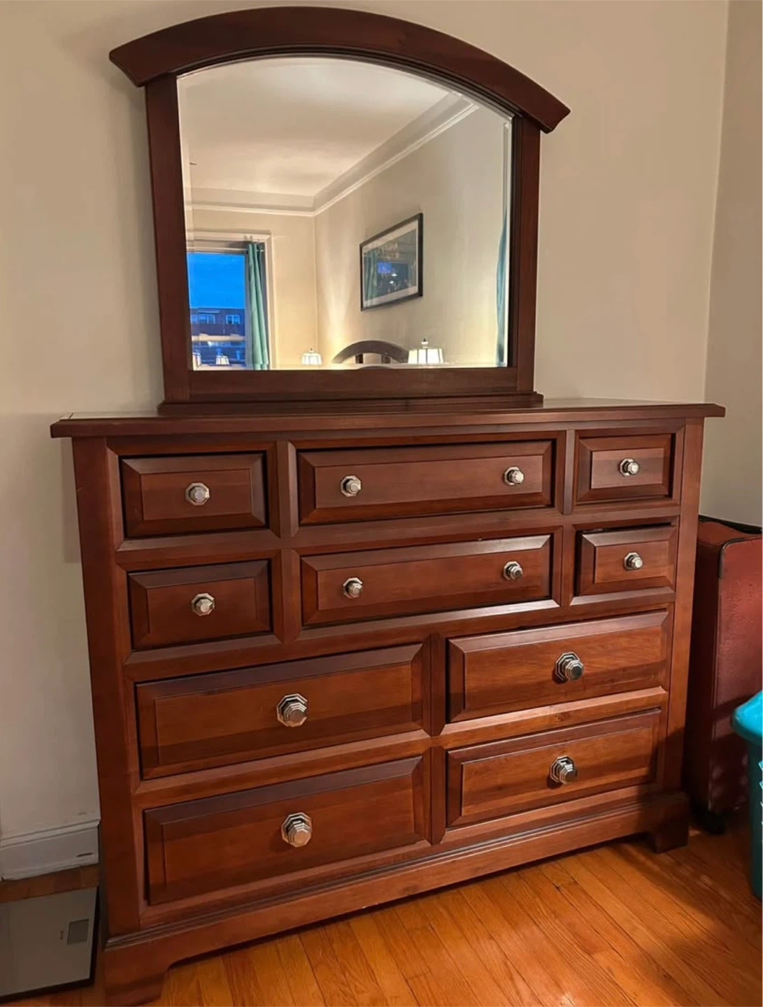 Selling a complete bedroom set! Includes a dresser with a mirror, a bed frame, and two nightstands. Hard to find construction like this these days! Elevator building, everything fits. Perfect for furnishing a bedroom with a classic, coordinated look