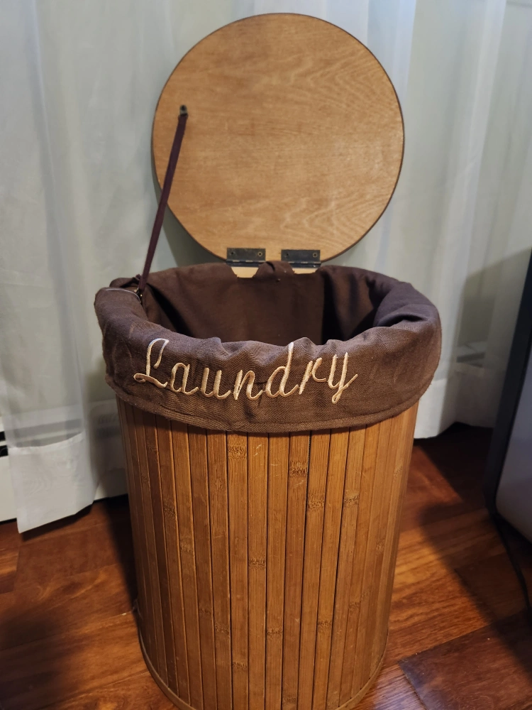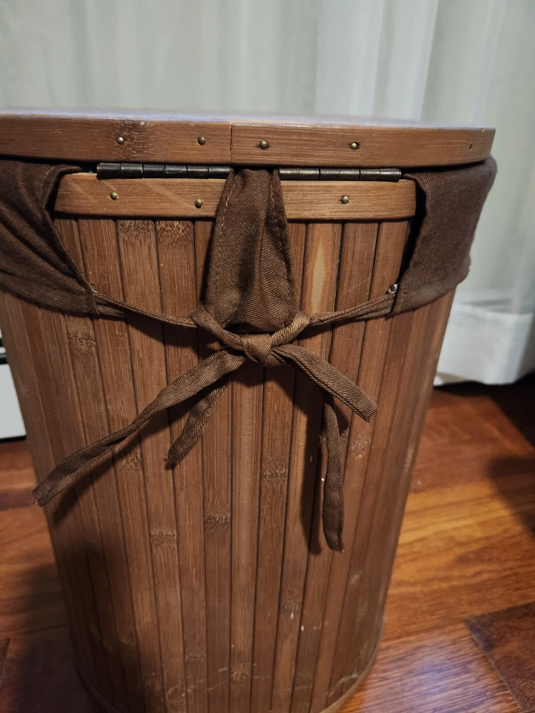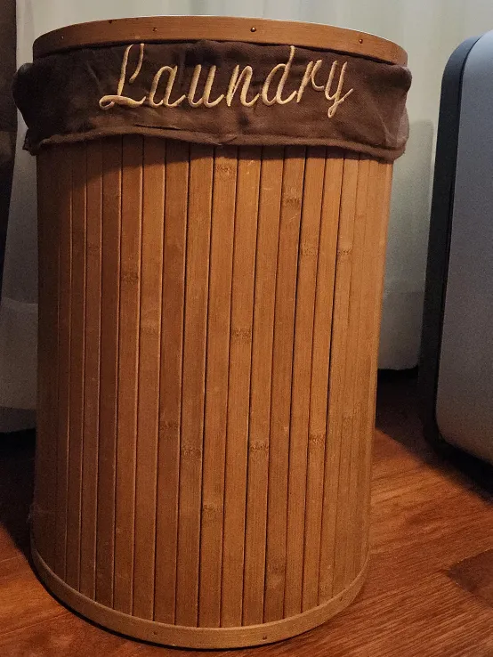 Vintage Laundry hamper. Made with a bamboo exterior and a fabric removable liner. Includes a lid with hinges. A stylish addition to keep your space organized and tidy.