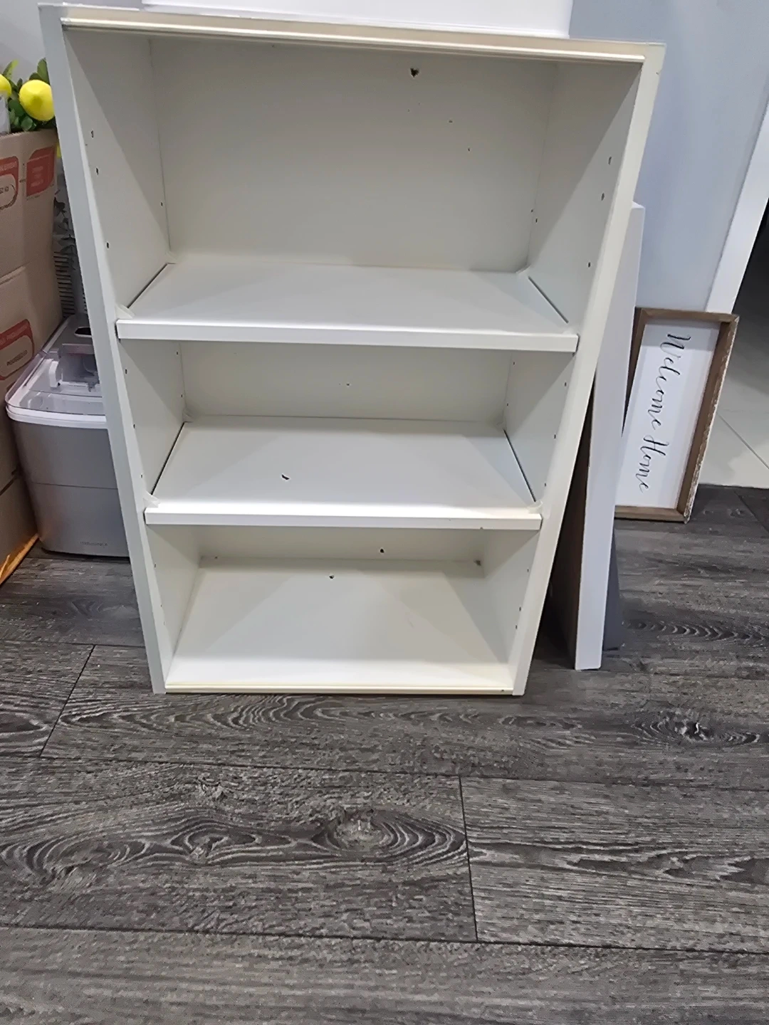 Selling a simple white bookshelf. It has three shelves and is in good condition. Perfect for storing books or displaying items!
