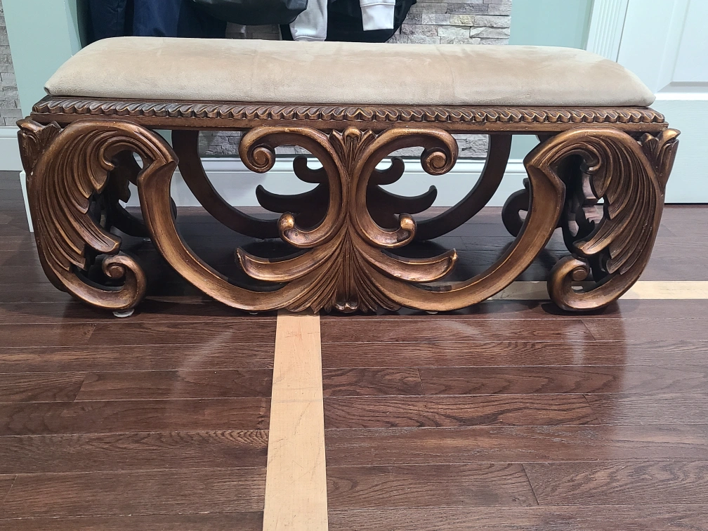 Beautiful decorative bench with ornate carved wood detailing and an upholstered seat. Crafted from wood and leather, this sturdy piece is perfect for an entryway or placed at the foot of a bed. Adds elegance and charm to any space.
