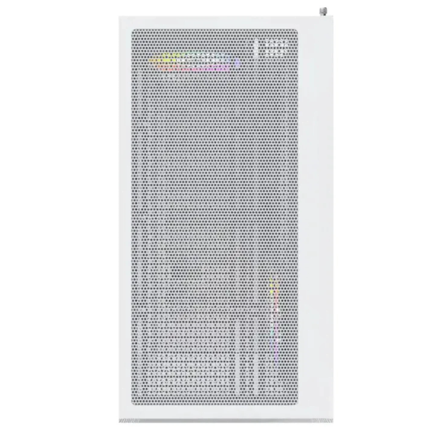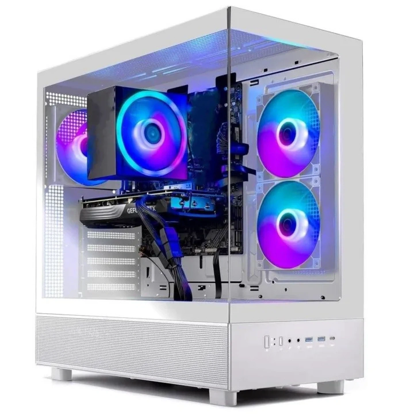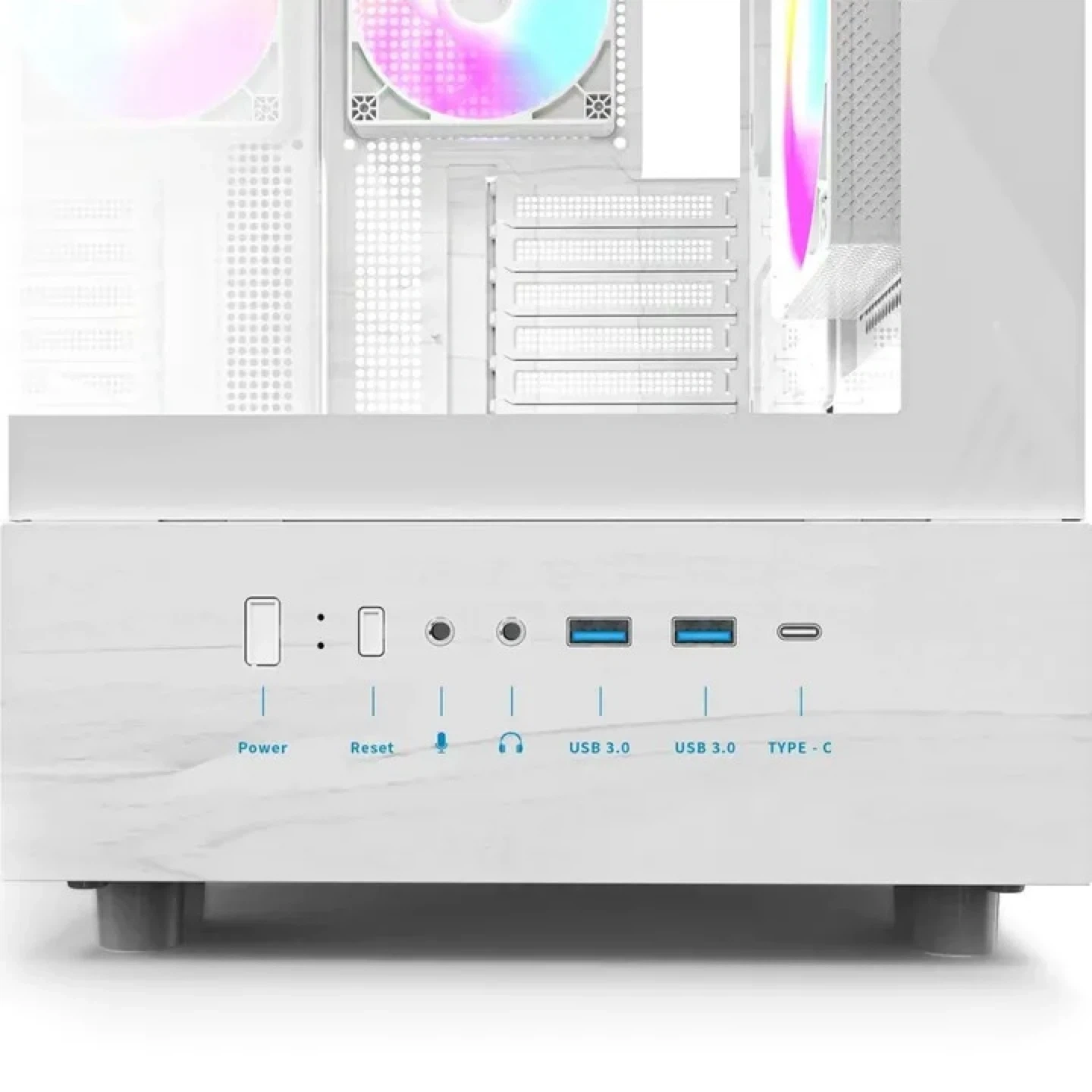 This is a white gaming PC case. It features a clean design with RGB lighting accents. The front panel includes USB 3.0 ports and a Type-C port. It's built for airflow and component visibility!