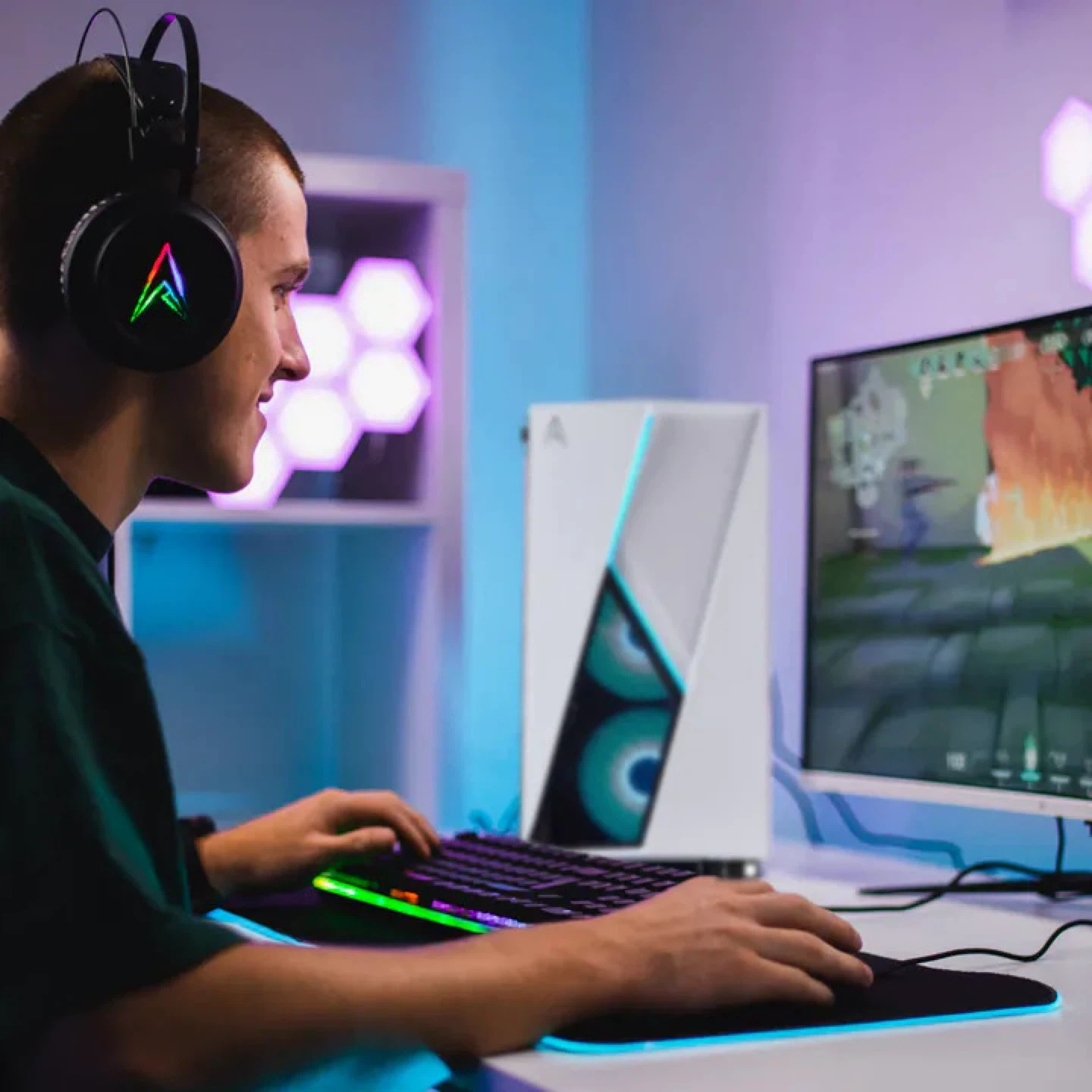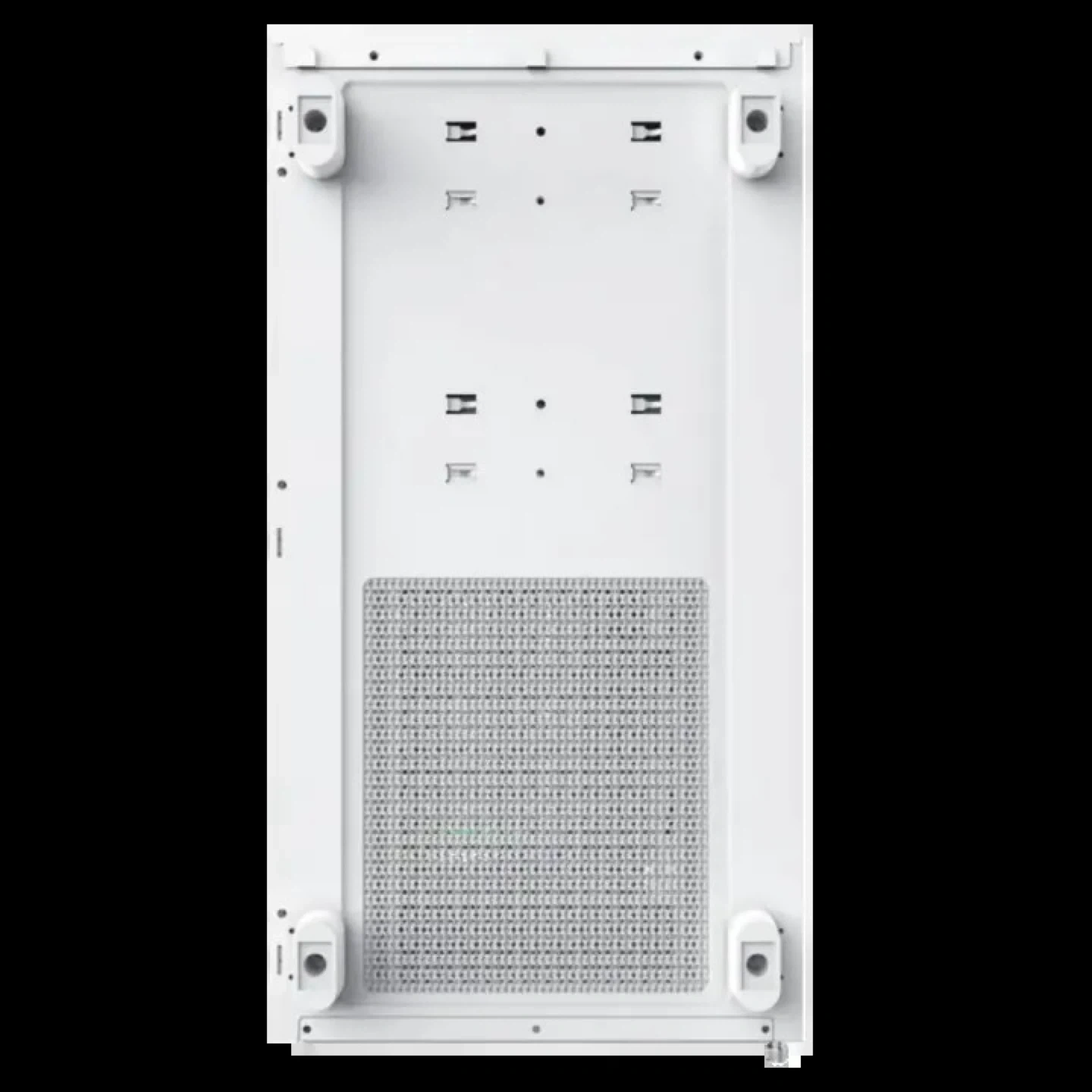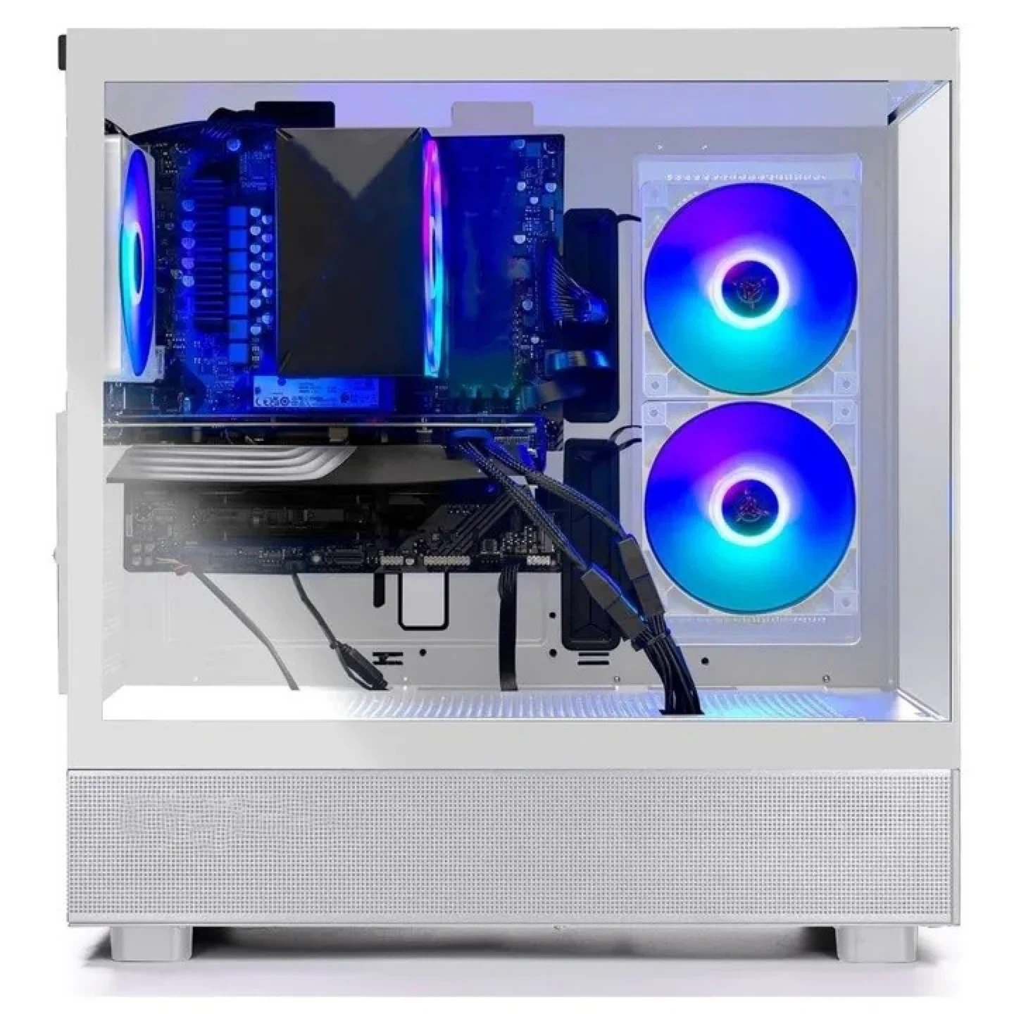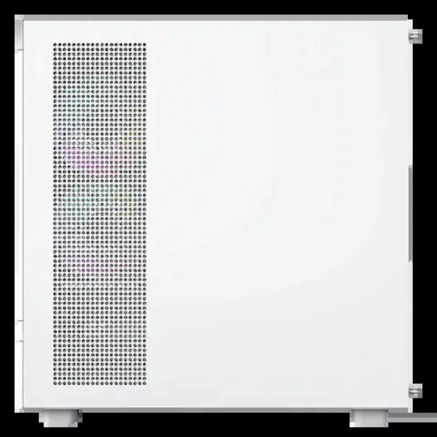 This is a white gaming PC case. It features a clean design with RGB lighting accents. The front panel includes USB 3.0 ports and a Type-C port. It's built for airflow and component visibility!
