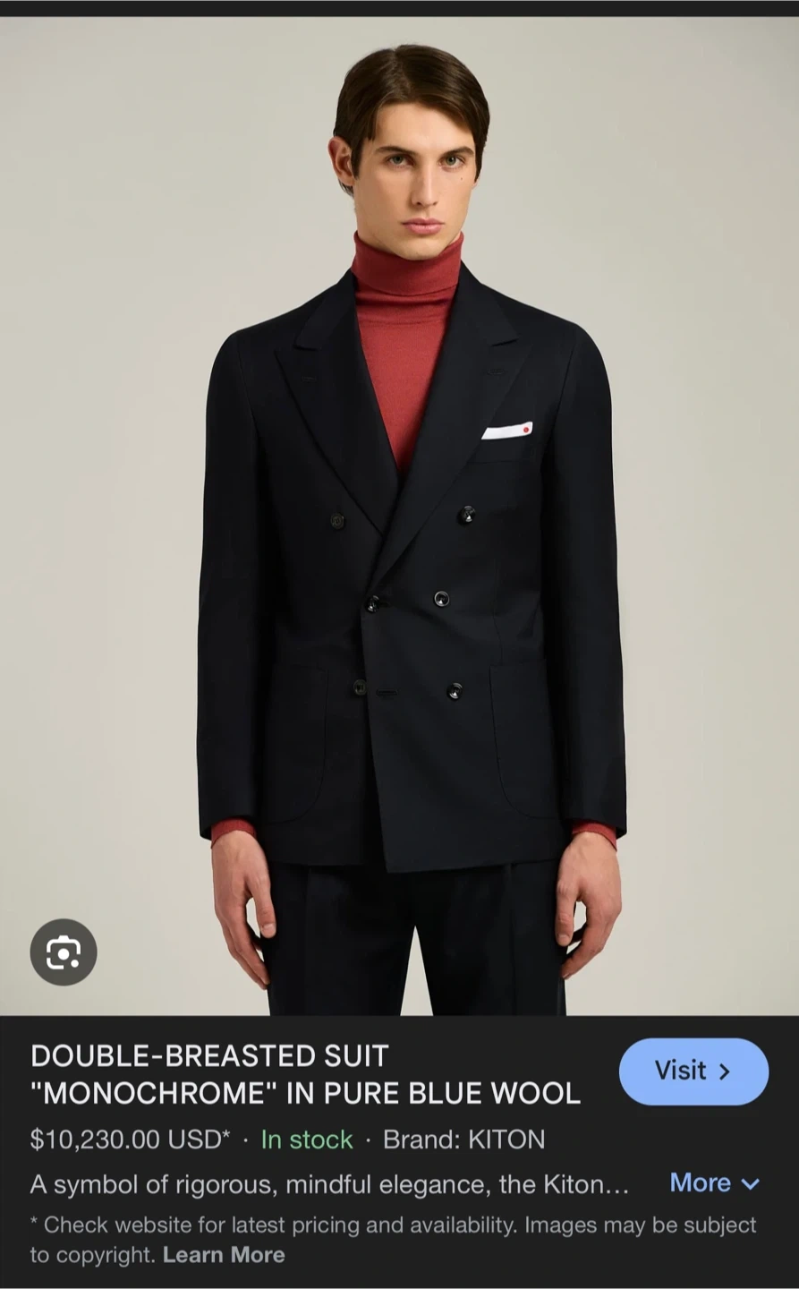Selling a KITON double-breasted suit in pure blacl wool. This suit is perfect for those who appreciate rigorous, mindful elegance. It's in great condition and ready for a new owner! It was worn three times only. One for wedding once for reception and once for a friend’s wedding. Size is 48 us.