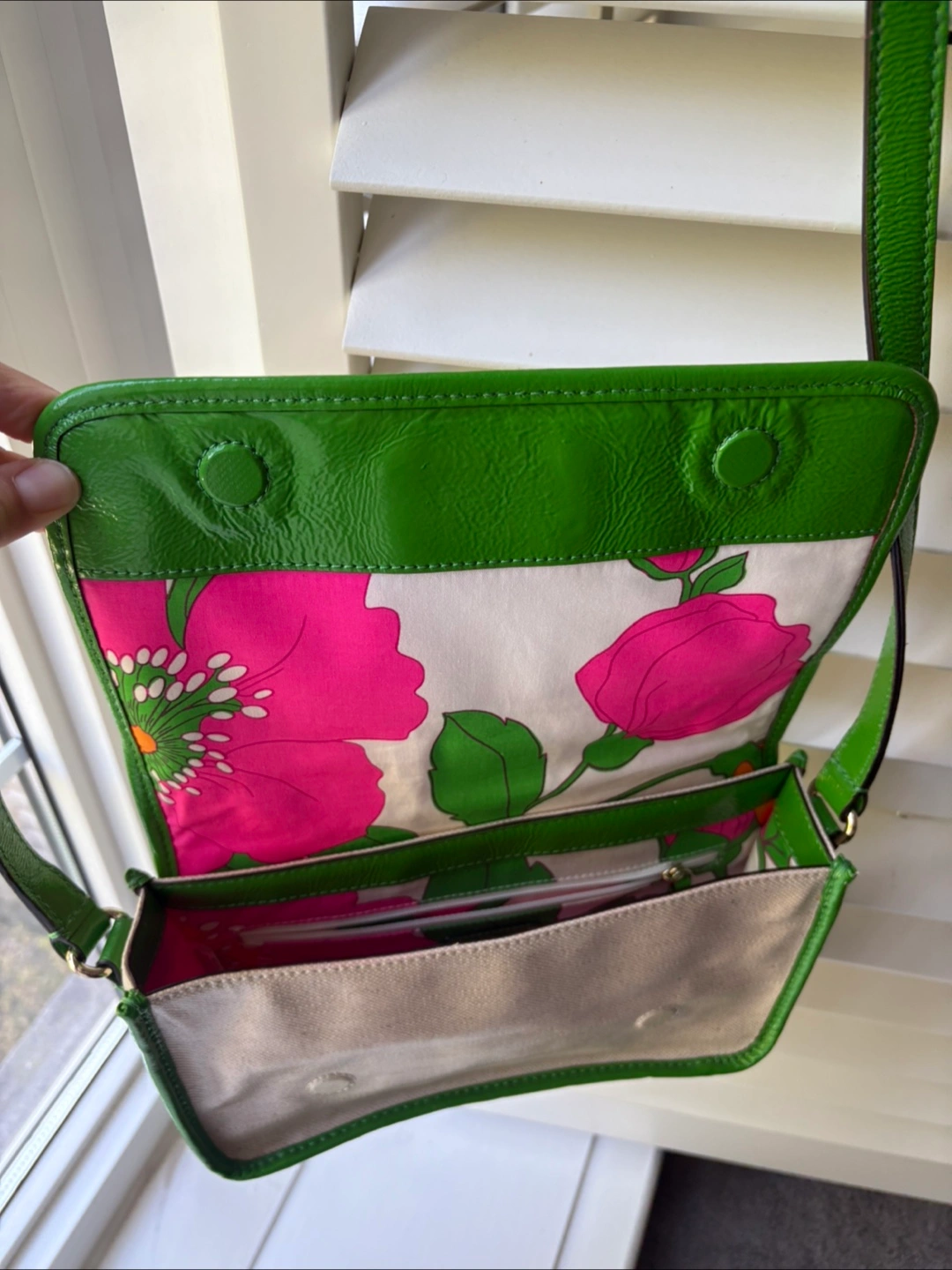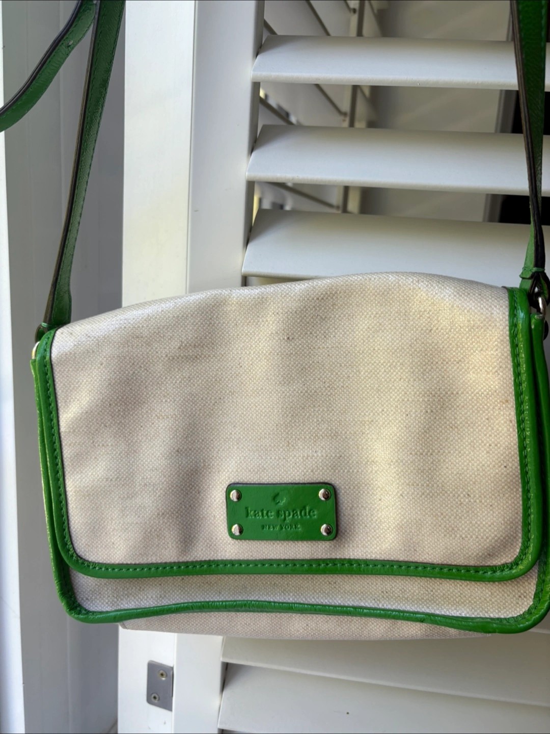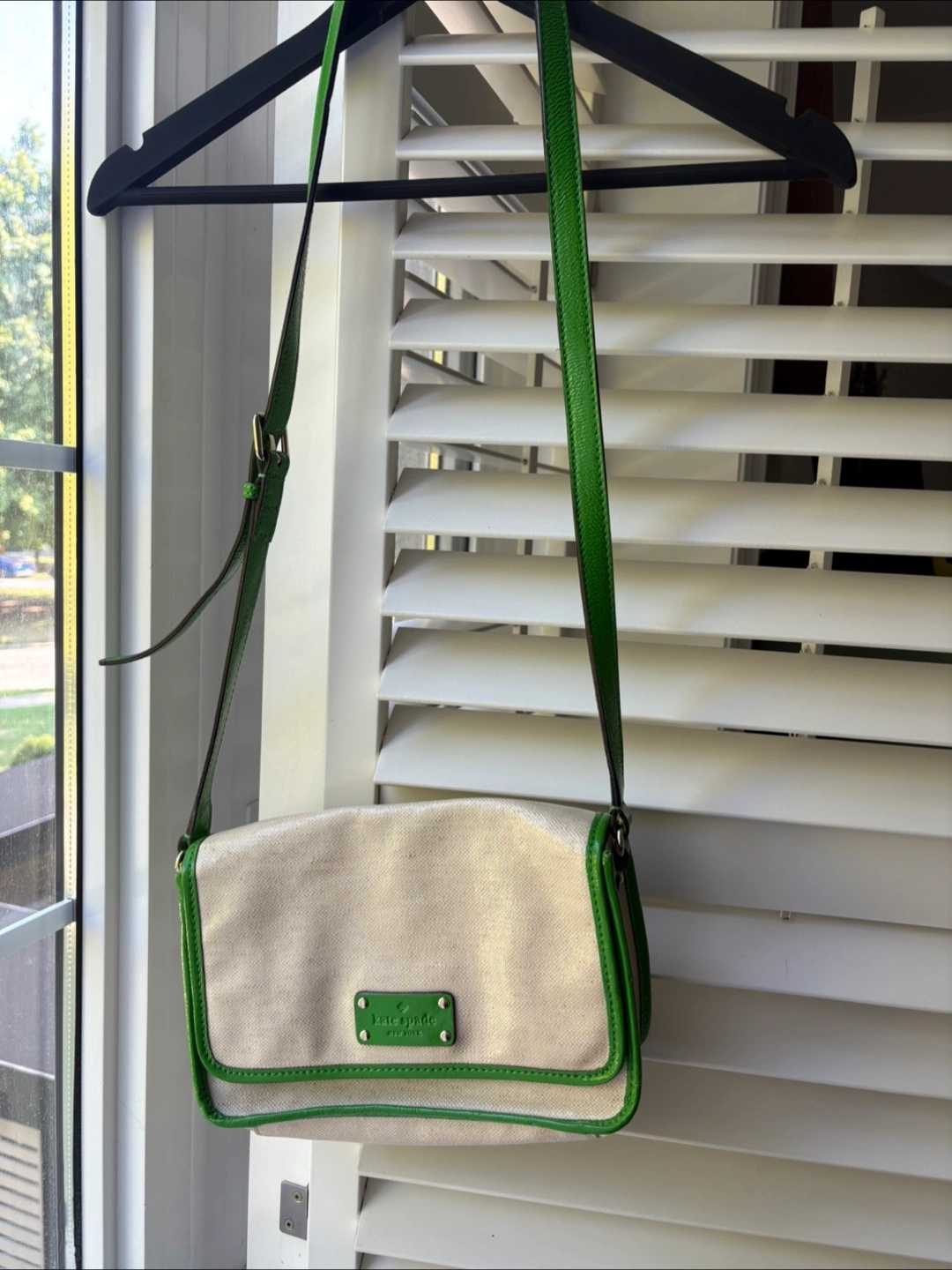 This is a Kate Spade crossbody bag in a lovely combination of green and beige. It's perfect for adding a touch of style to your outfit.
