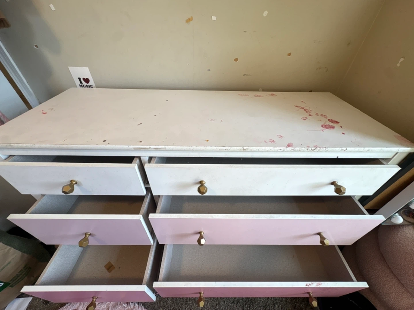 Buy & SellWhite and Pink Dresser with 6 DrawersWhite and Pink Dresser with 6 Drawers$64White dresser with pink drawer fronts and gold knobs. It features six drawers for storage. White wood construction.ConditionOkayWHERE TO MEETCheck LocationView MapSELLERNickaypaBensenville50 reviews0 chats