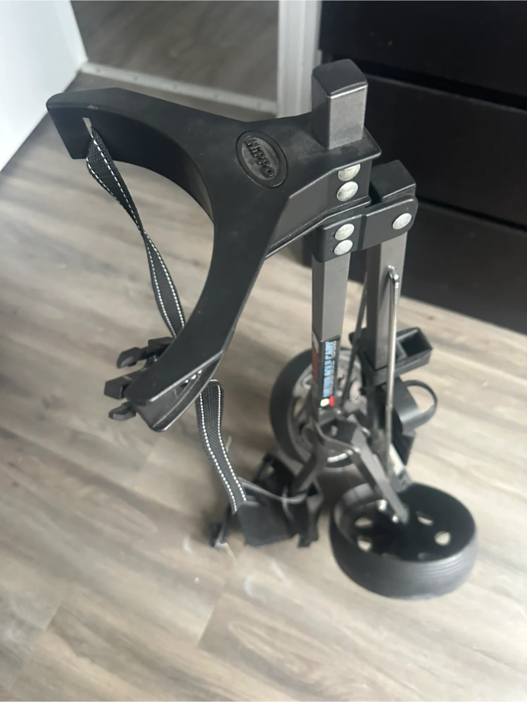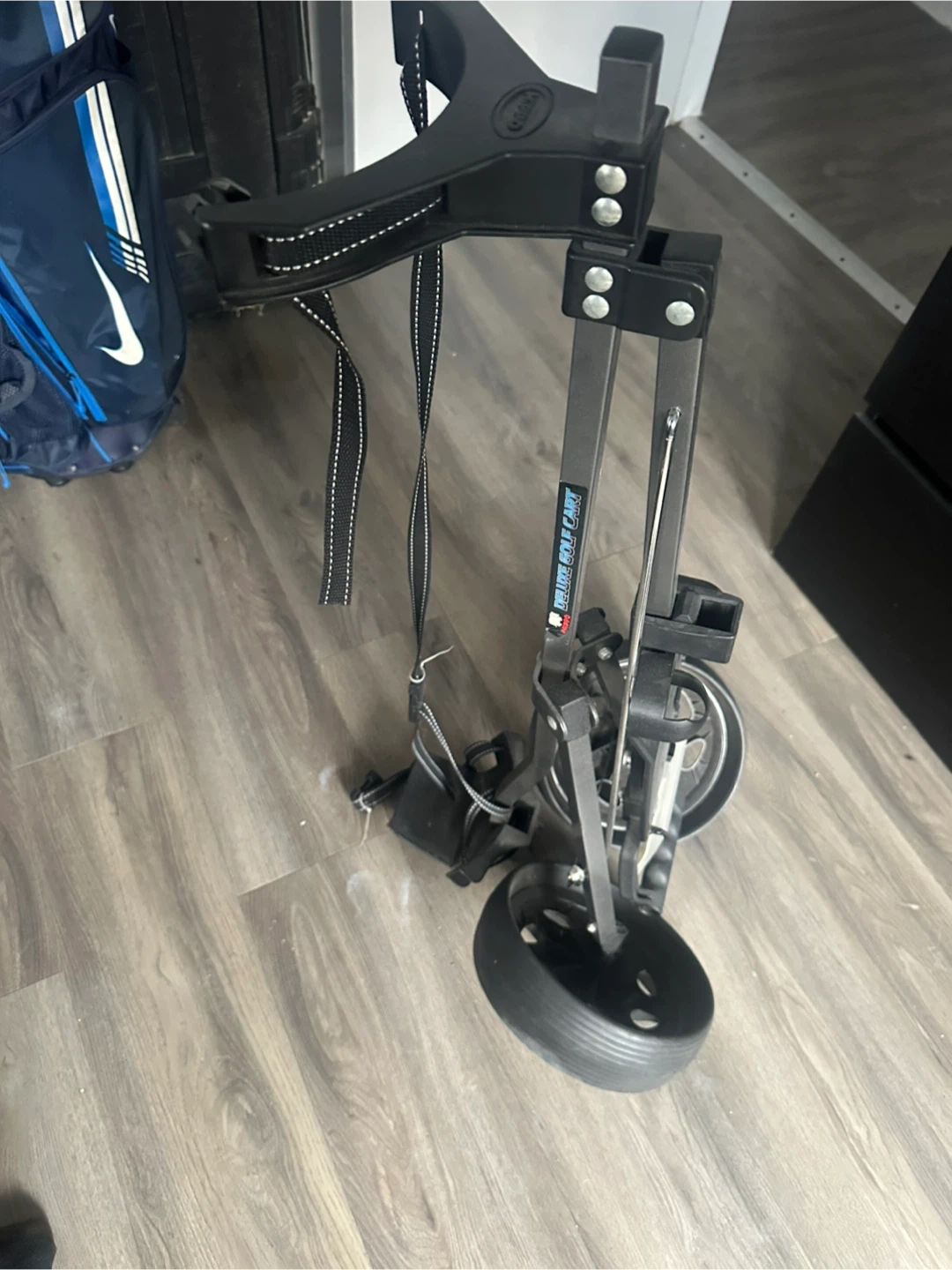 This is a deluxe golf cart. It's black and made of metal and plastic. It has adjustable straps for securing your bag. This cart is great for carrying your golf clubs around the course!