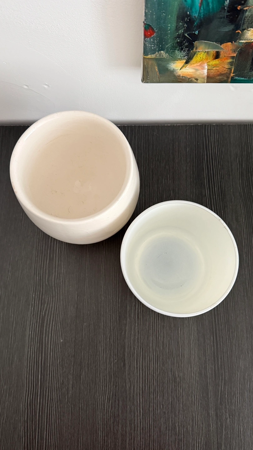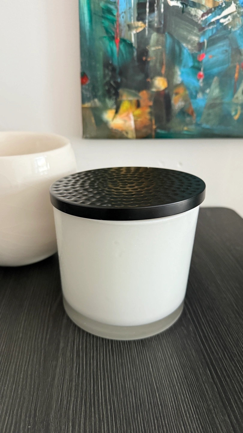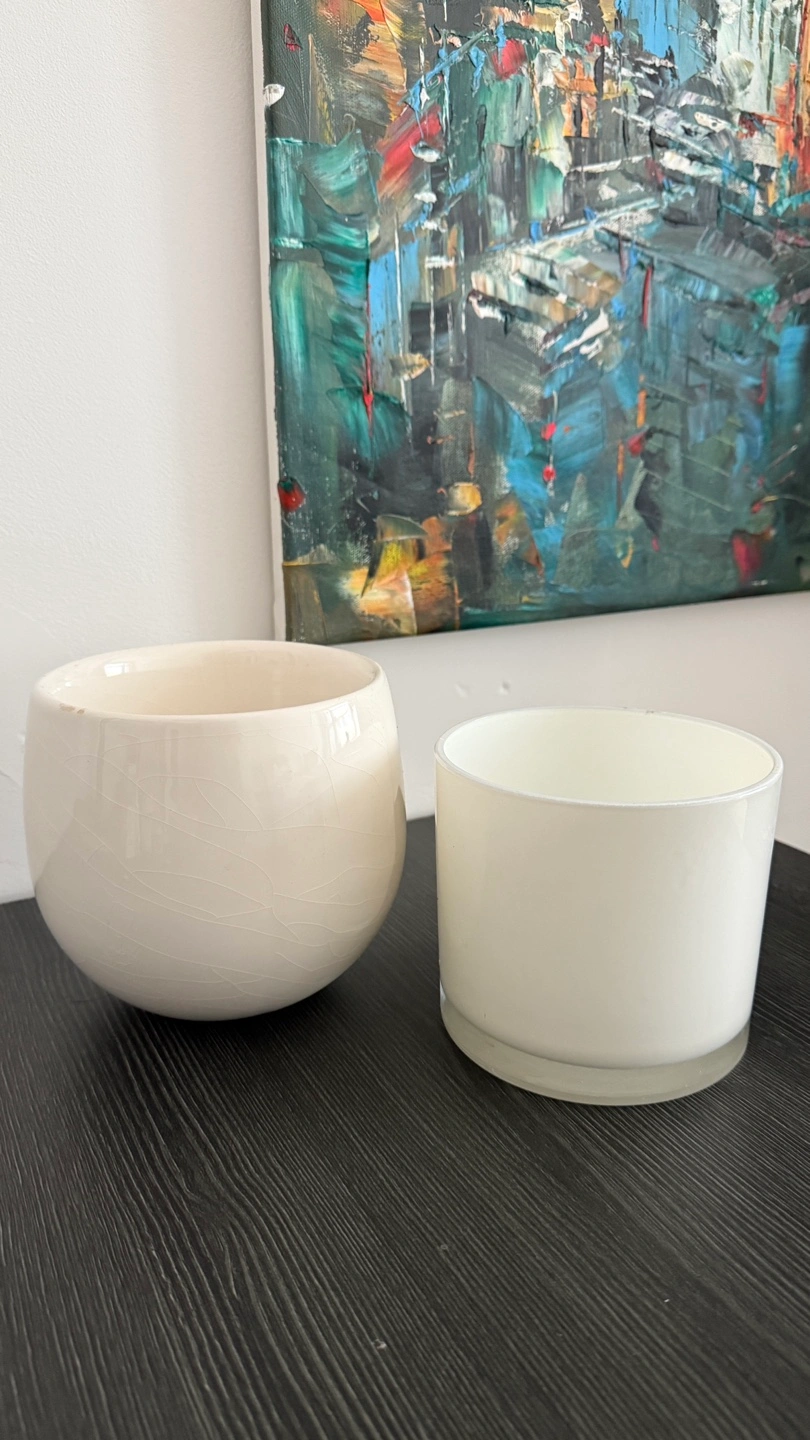 Gifting set of two pots One is a round, off-white ceramic holder, and the other is a white glass holder with a black textured lid. They're both in great condition and ready to add a cozy touch to your space.