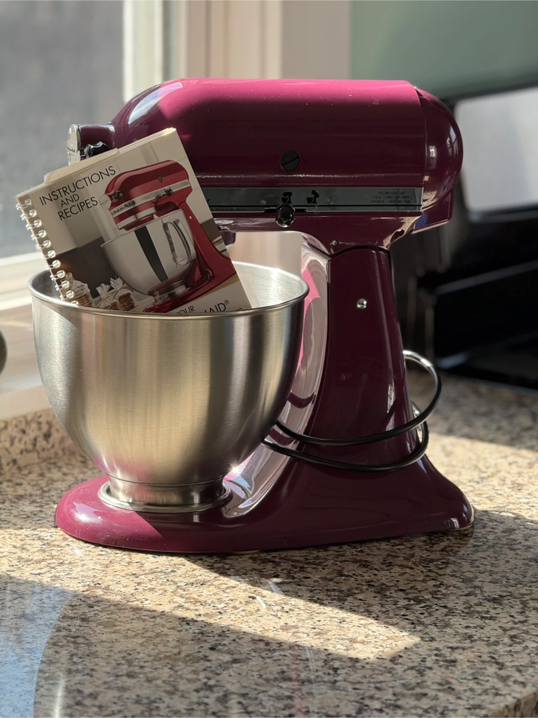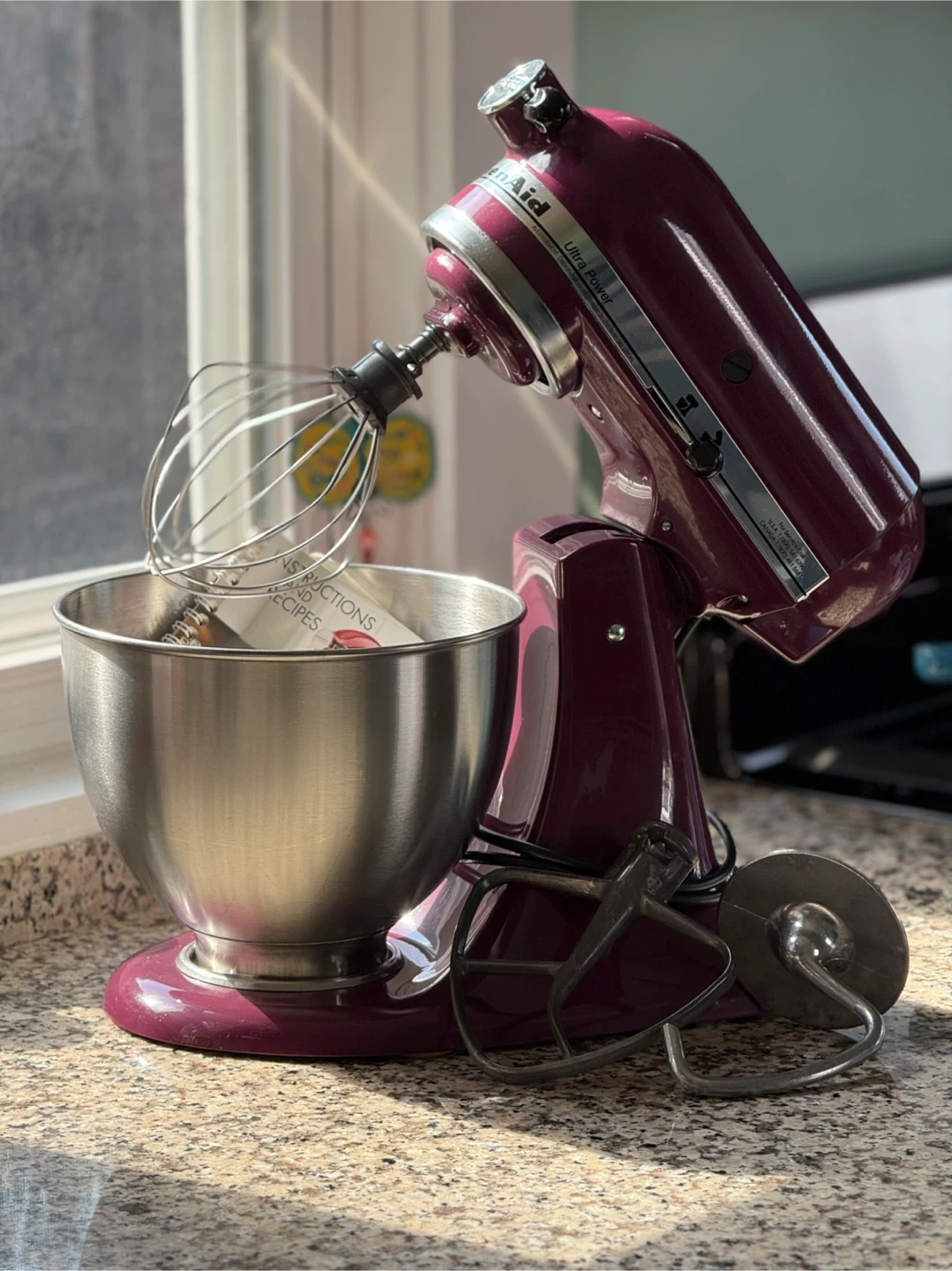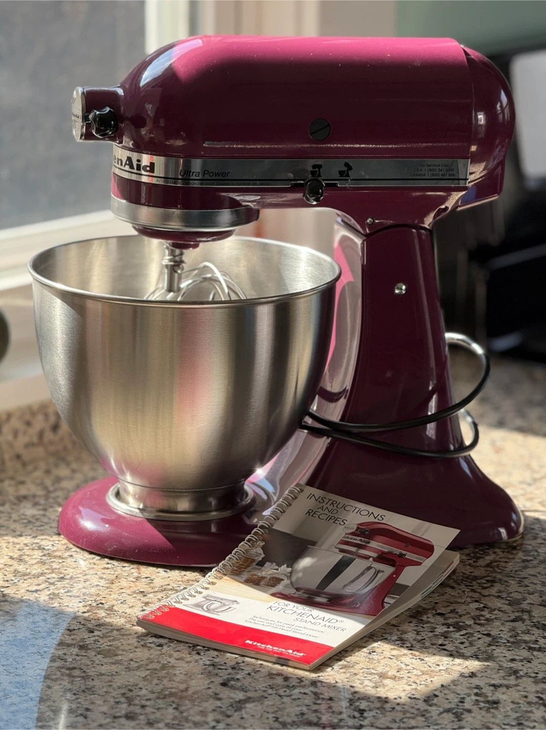 This is a KitchenAid Ultra Power stand mixer in a deep berry color. It comes with a stainless steel bowl, flat beater, dough hook, whisk, and instruction manual. This mixer is perfect for all your baking needs!