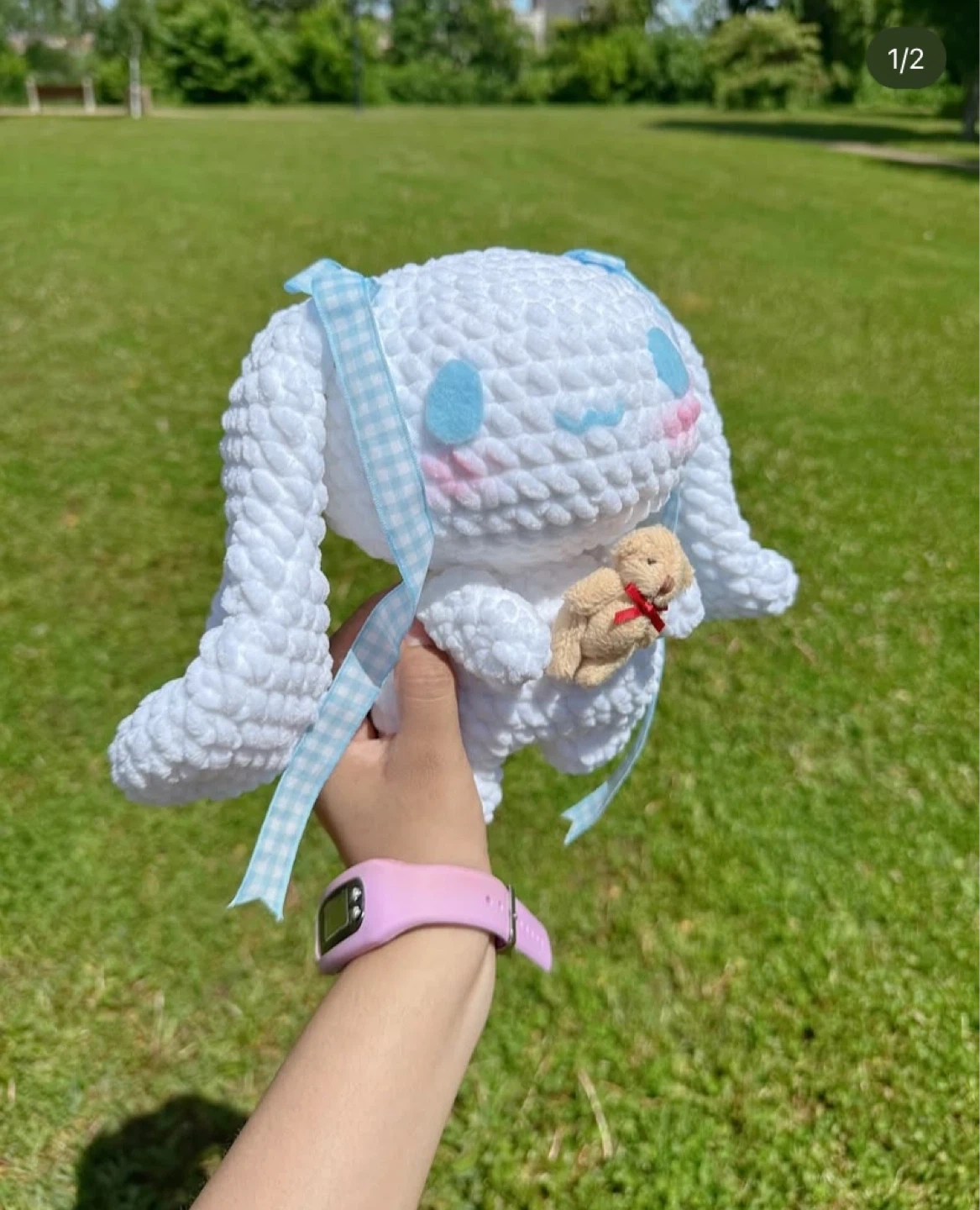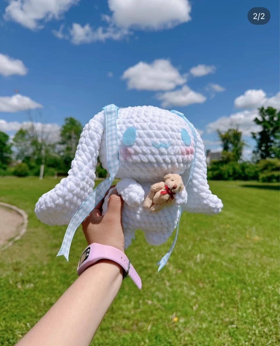 This is a cute, handmade Cinnamoroll plush toy. It's crocheted with soft white yarn and features blue ear accents and a small teddy bear accessory. A light blue checkered ribbon is tied around its neck.