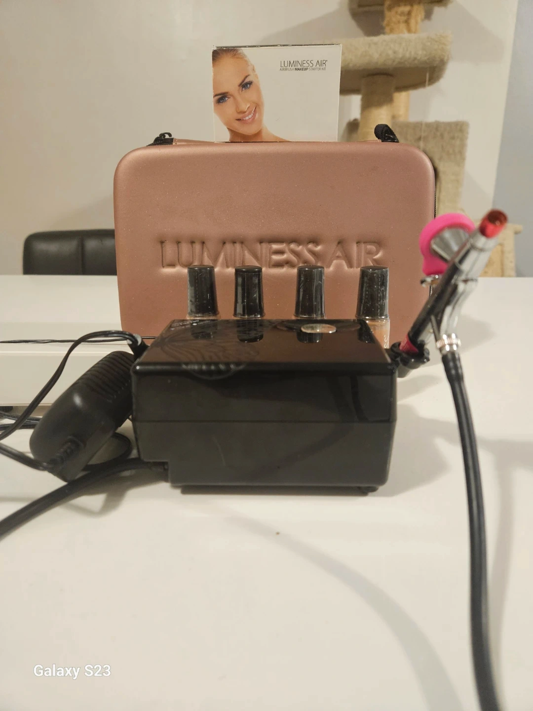 This is the Luminess Air Airbrush Makeup Starter Kit. It includes the airbrush system and a rose gold carrying case. This kit is great for achieving a flawless complexion. Includes portable go battery.