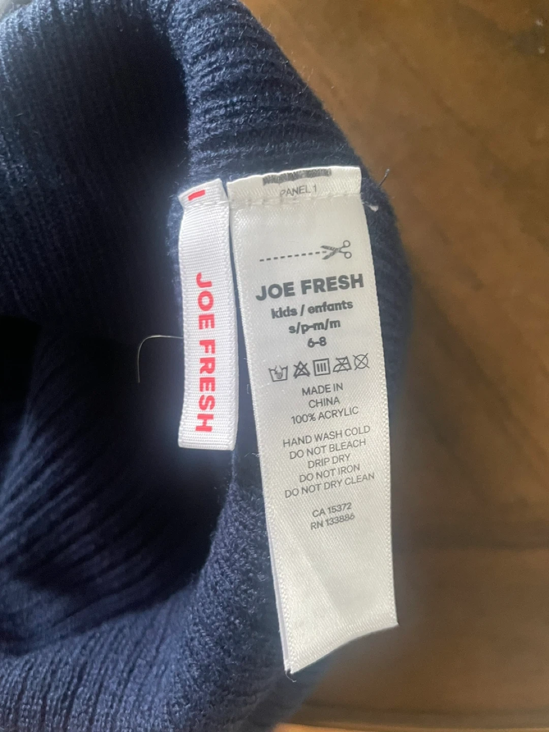 Selling a Joe Fresh kids beanie hat. It's a size S/P-M/M, which fits kids aged 6-8. The hat is made of 100% acrylic and is a nice navy colour!