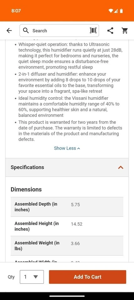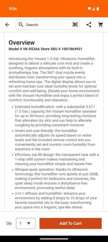 Vissani 1.5 Gallon Cool Mist Humidifier