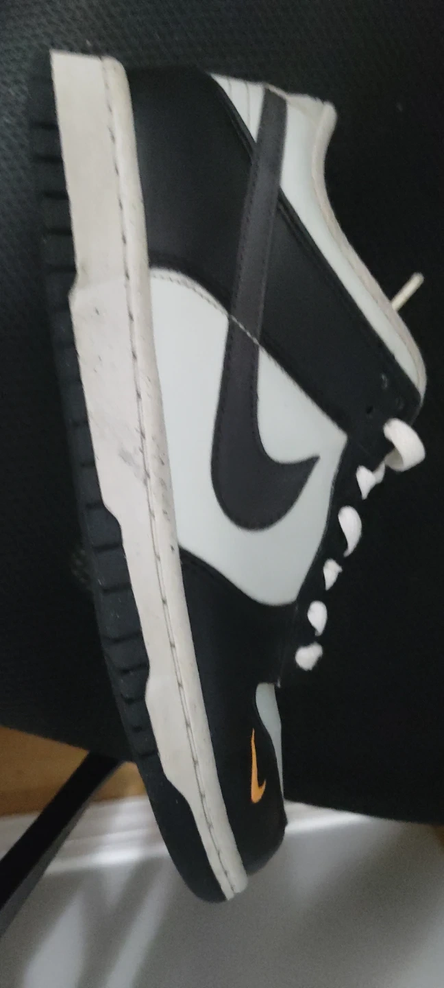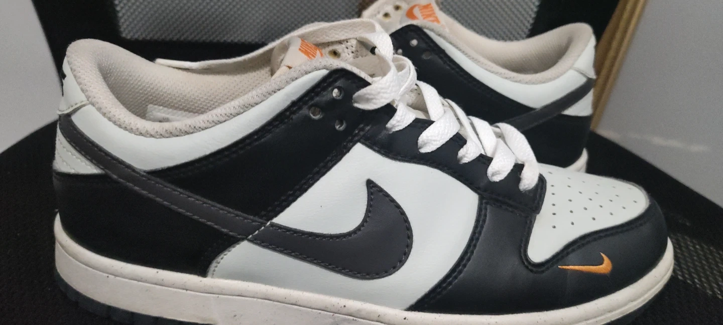 These are Nike Dunk Low sneakers in a white, black, and orange colorway. They feature a leather upper and rubber sole. Perfect for everyday wear!