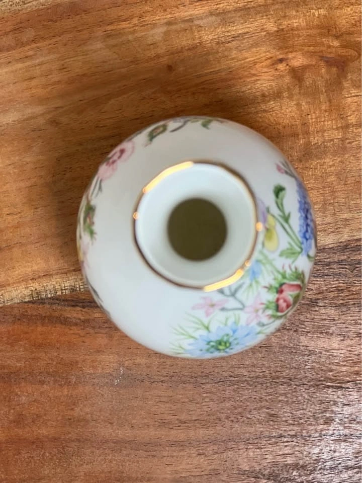This is an elegant Aynsley "Wild Tudor" Globe Bud Vase, made of fine English Bone China. The "Wild Tudor" pattern was produced from 1991 to 2001 and is now discontinued. It features a beautiful bouquet of wildflowers and a gold-gilded rim. Approximately 6 inches tall. Preowned. Pickup is at 58th and 7th Ave in Midtown Manhattan.