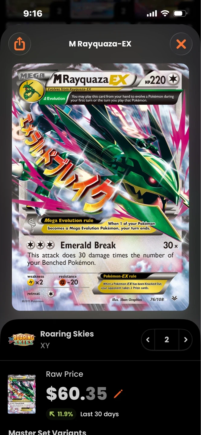 Mega Rayquaza EX card from the Roaring Skies XY set. This card features the Emerald Break attack and has 220 HP. It's part of the 2015 Pokemon collection. This card is useful for Pokemon TCG players looking to add a powerful Mega Evolution to their deck.