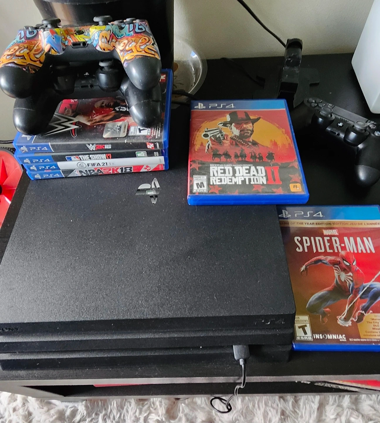Sony PlayStation 4 Pro console, often called a PS4 Pro. It comes with several popular games: Red Dead Redemption 2, Marvel's Spider-Man, WWE 2K16, MLB The Show 17, FIFA 21, and NBA 2K18. Also included is a customized controller and a standard black controller. It's ready for gaming!