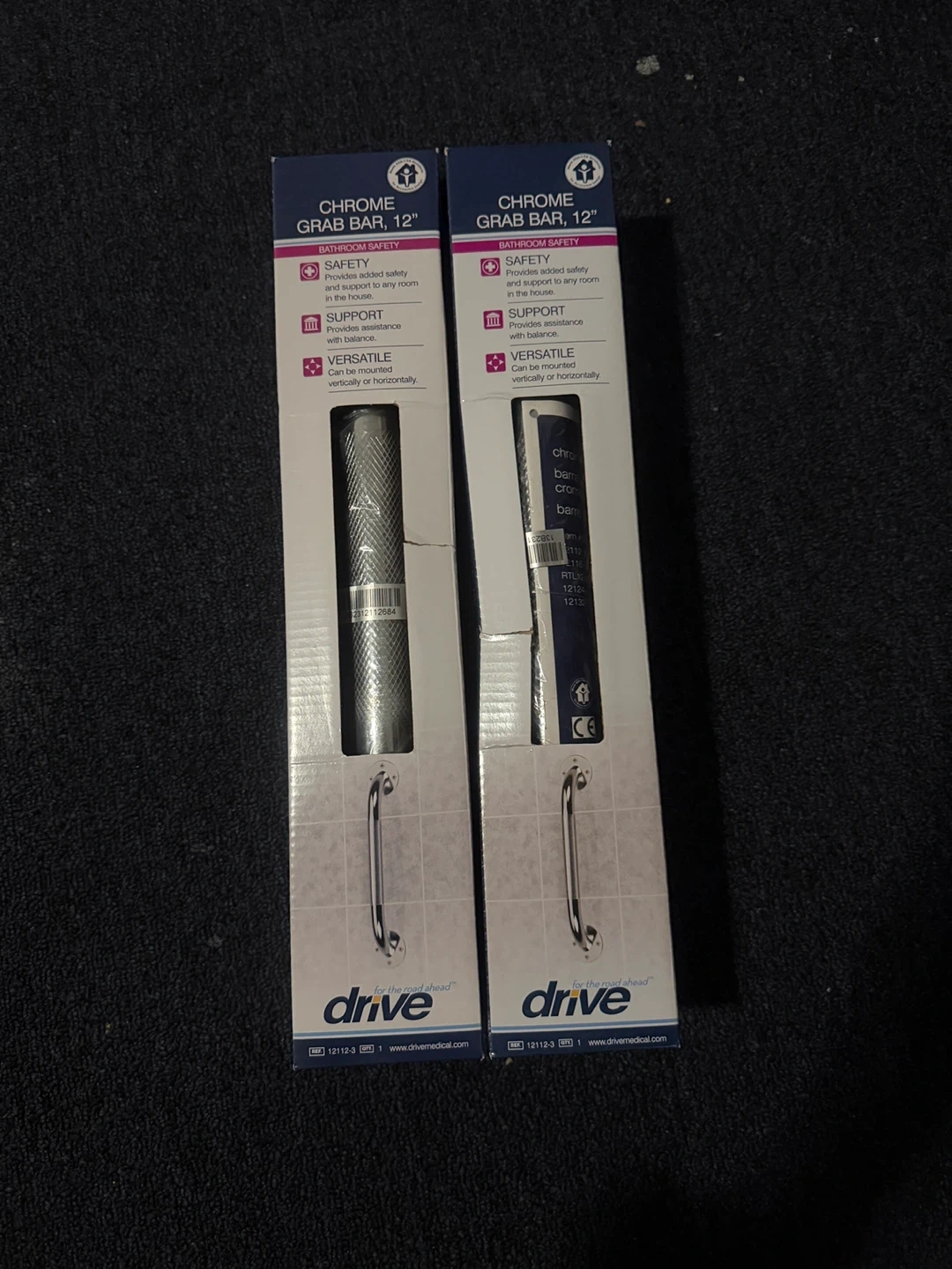 This is a Drive Medical 12-inch chrome grab bar. It's designed for bathroom safety and can be mounted vertically or horizontally. Provides added safety and support. 2 available