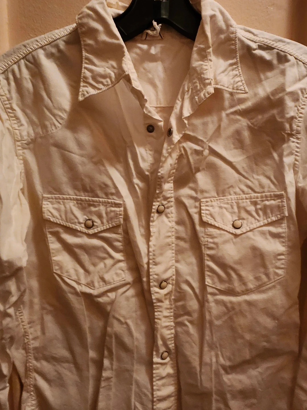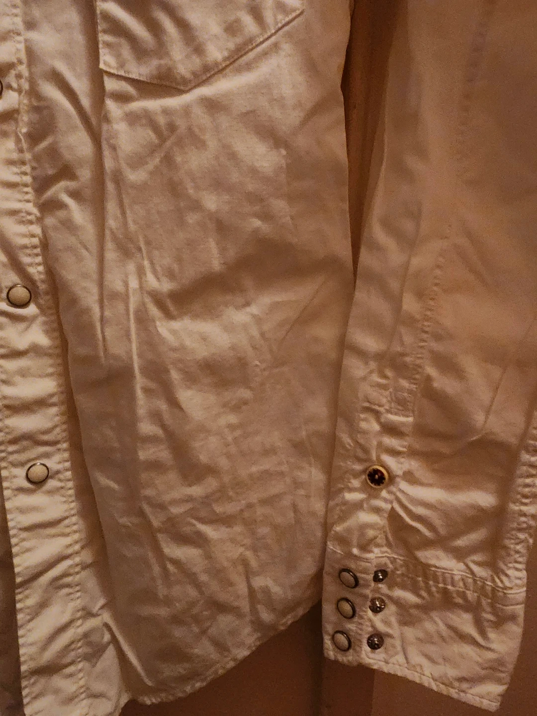 WOMENS LONG-SLEEVE SHIRT - WITH 2 CHEST POCKETS. White western-style shirt. Snap-style button closure. Snap buttons are on the front and cuffs.