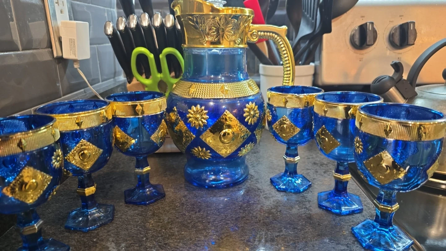Beautiful blue and gold decorative glass jug with 6 matching cups for sale. This elegant set features vibrant cobalt blue glass with detailed gold accents, making it perfect for serving drinks at gatherings or displaying as a unique centerpiece.