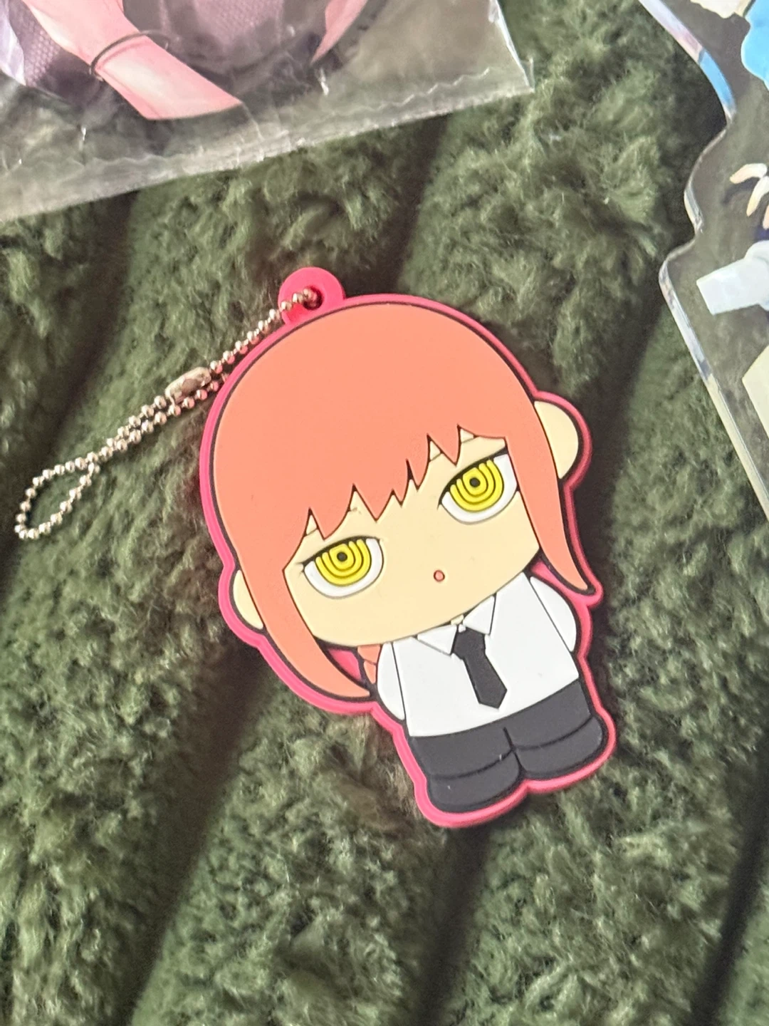 This lot includes an acrylic standee featuring various Genshin Impact characters, a Makima keychain from Chainsaw Man. These collectibles are great for any anime fan's display.