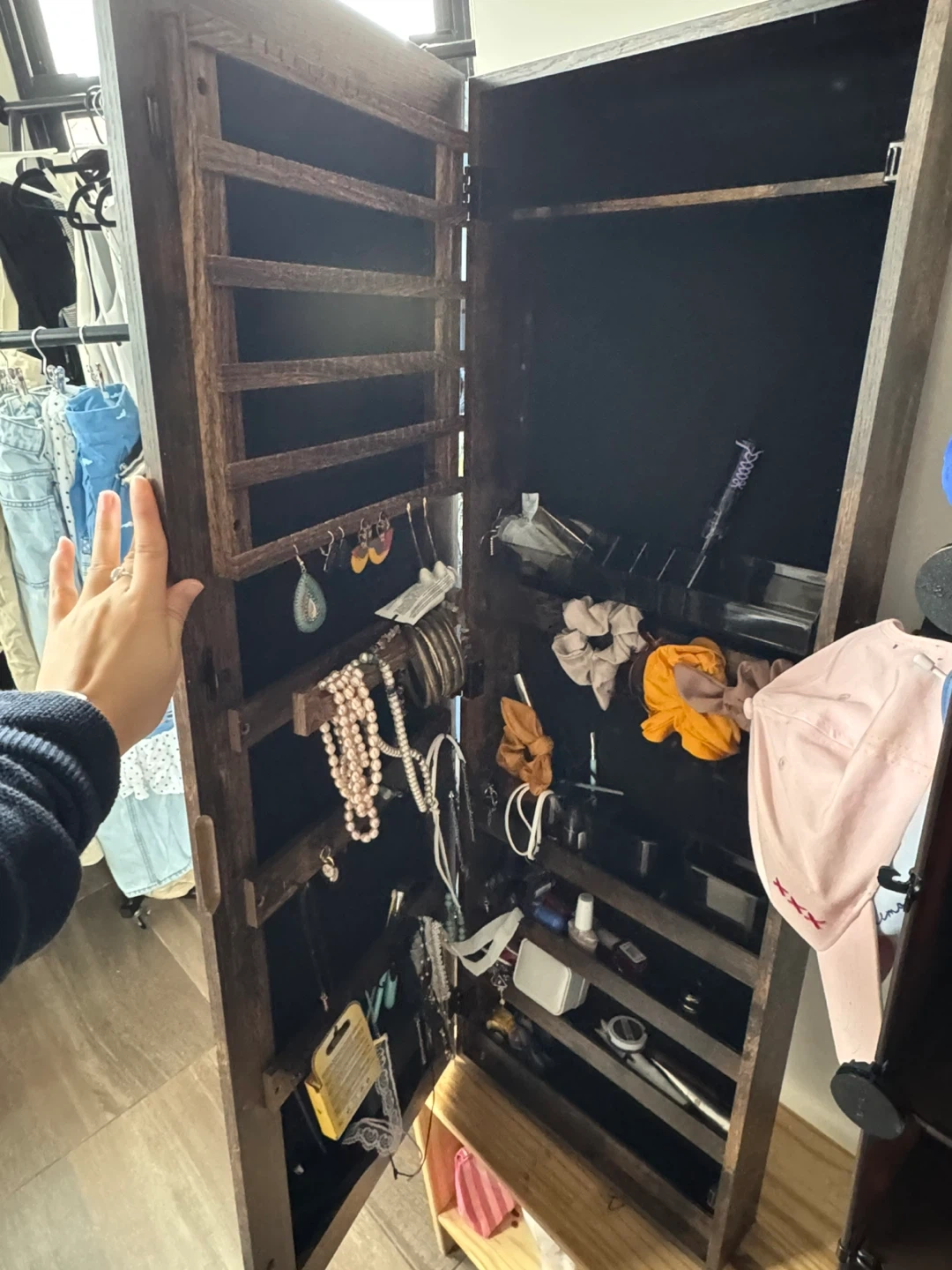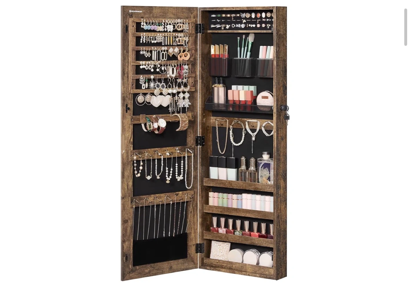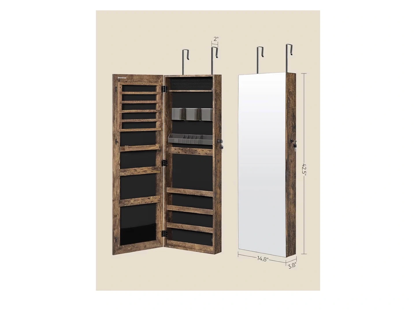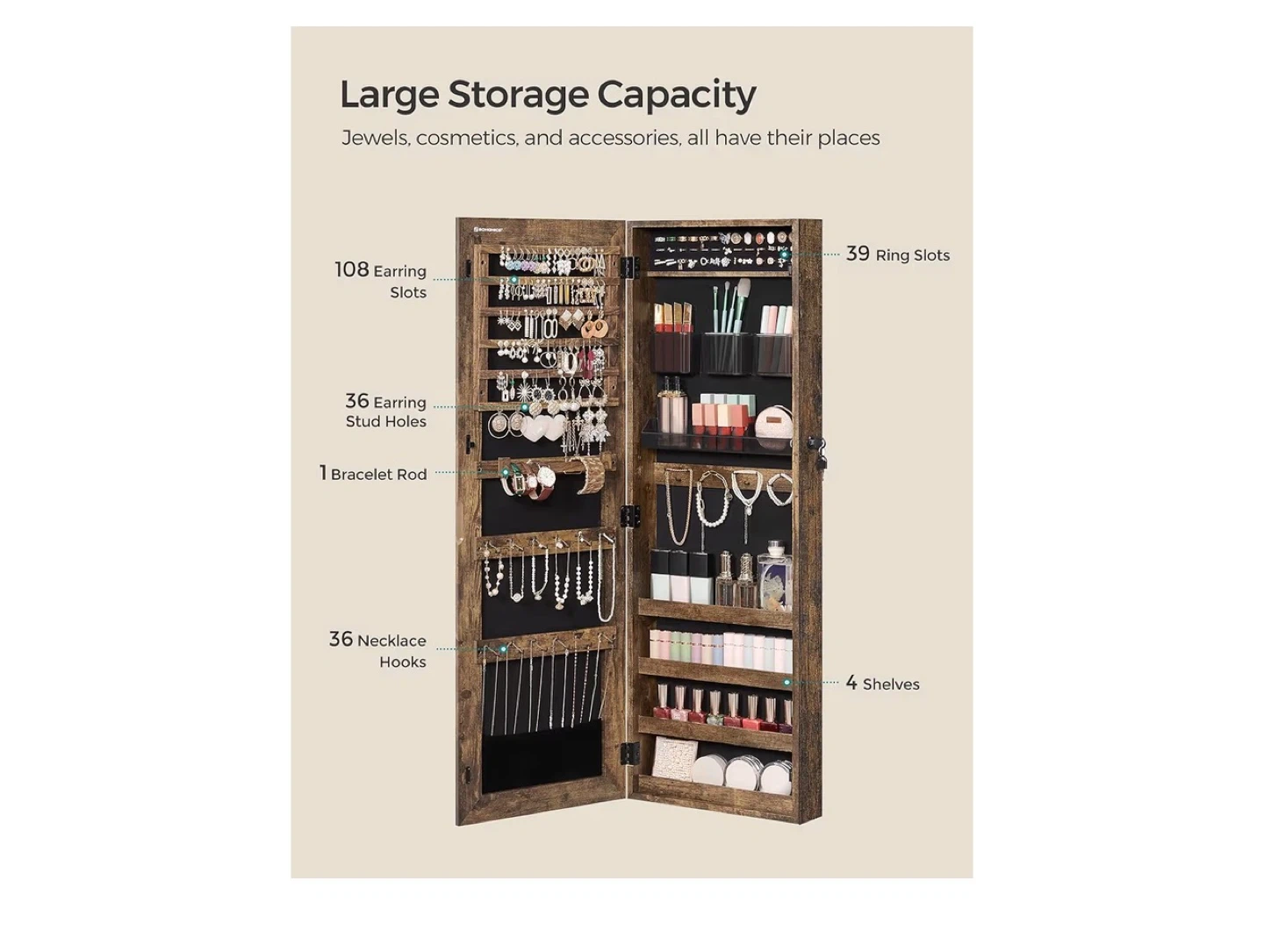 This jewelry armoire offers ample storage for your accessories. It features 108 earring slots, 36 earring stud holes, 36 necklace hooks, and 1 bracelet rod. It also includes 39 ring slots and 4 shelves for additional items. The exterior has a full-length mirror.