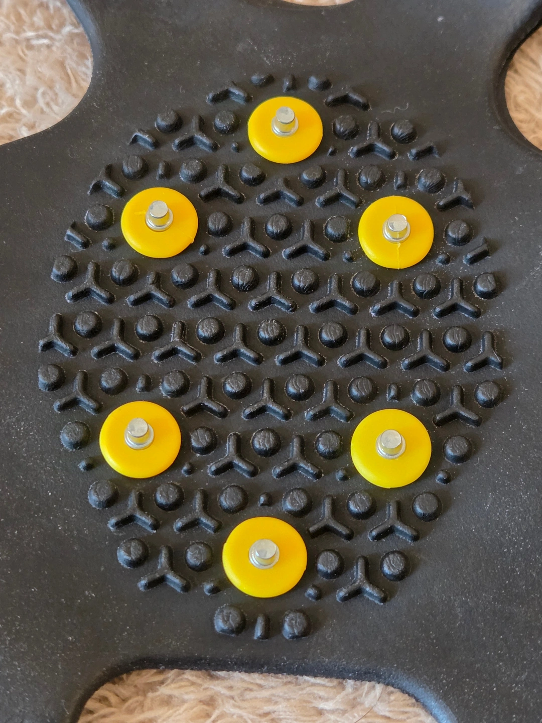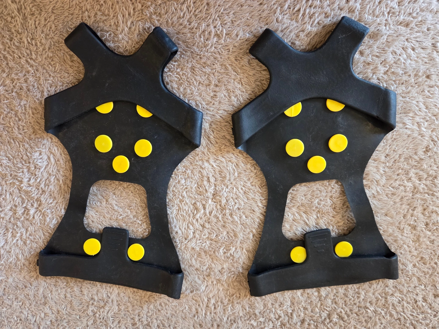 – Key specs: stretchable TPE rubber frame; 10 steel studs per foot (6 forefoot + 4 heel); toe and heel traction pads; fits over shoes or winter boots; quick on/off pull tab.
