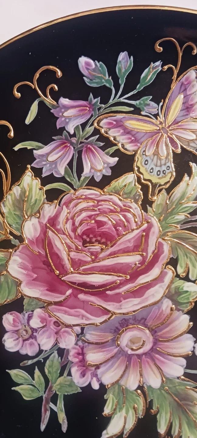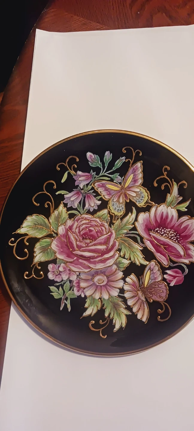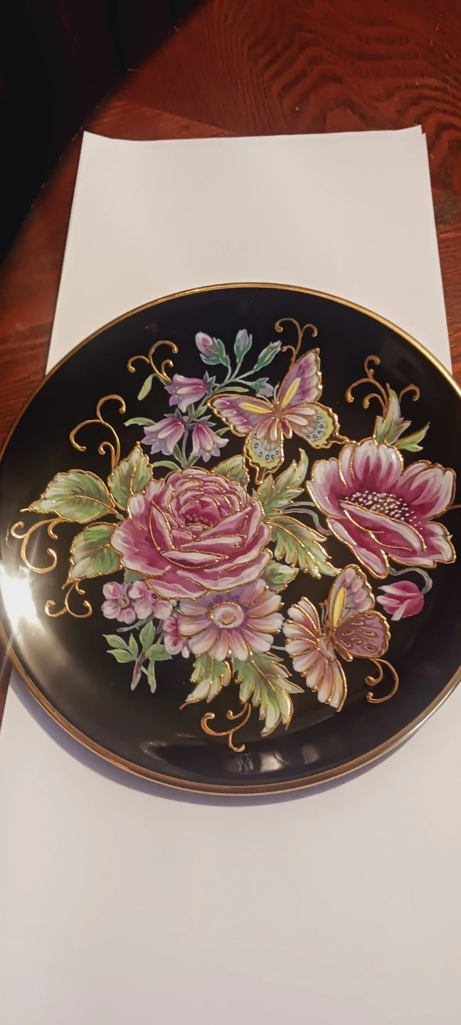 This decorative plate is hand-painted with a floral and butterfly design. It's accented with 24K gold trim. Hand-made in Greece by J. Spyropoulos. It's a beautiful piece for display! 9" diameter. Handmade Handpainted in Greece 馃嚞馃嚪. ALL MY PRICES ARE NEGOTIABLE !!