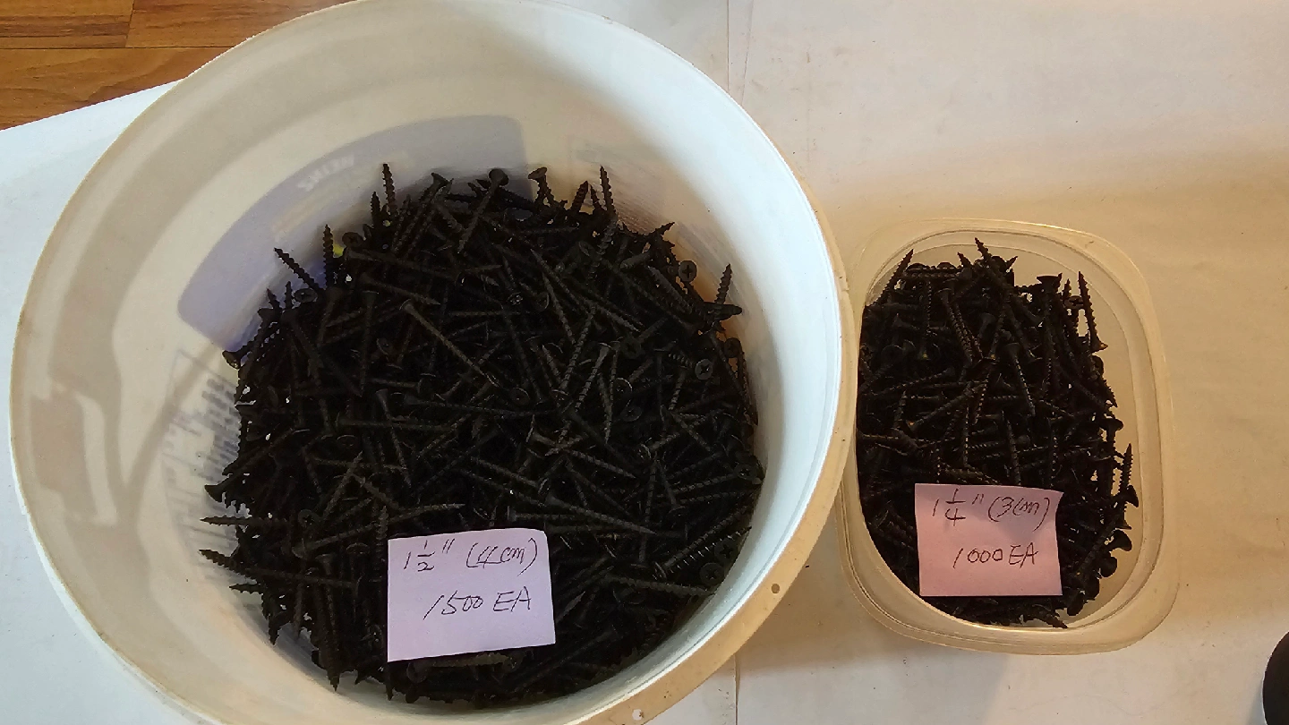 235I have a bucket of 1 1/2" (4cm) screws, about 1500 of them! Also a container of 1 1/4" (3cm) screws, around 1000 in that one